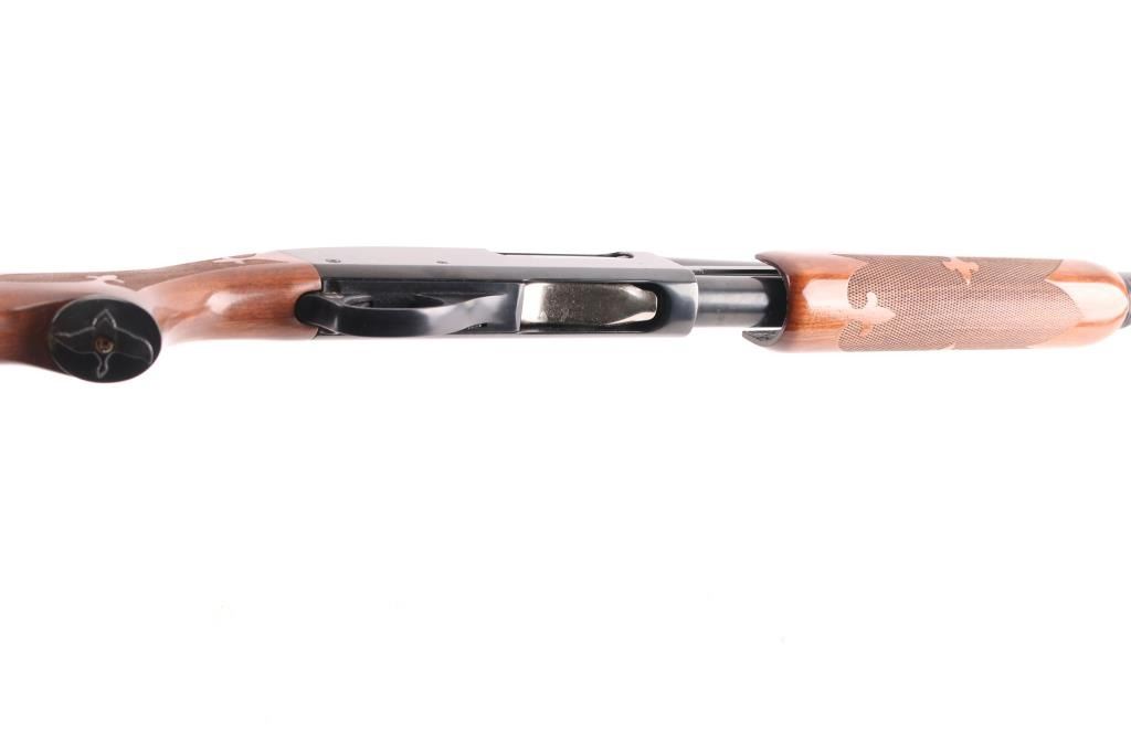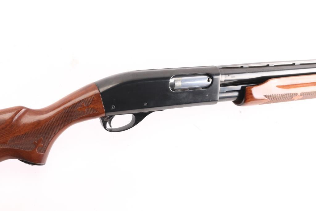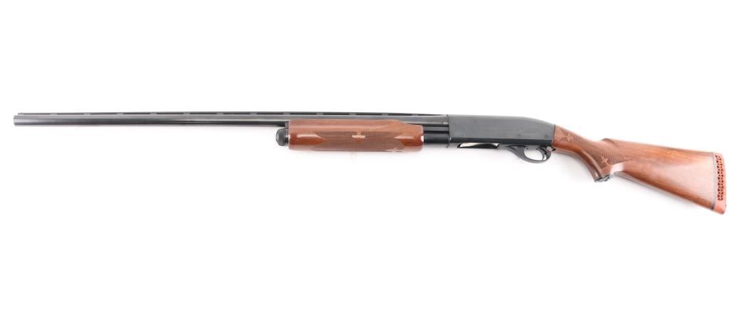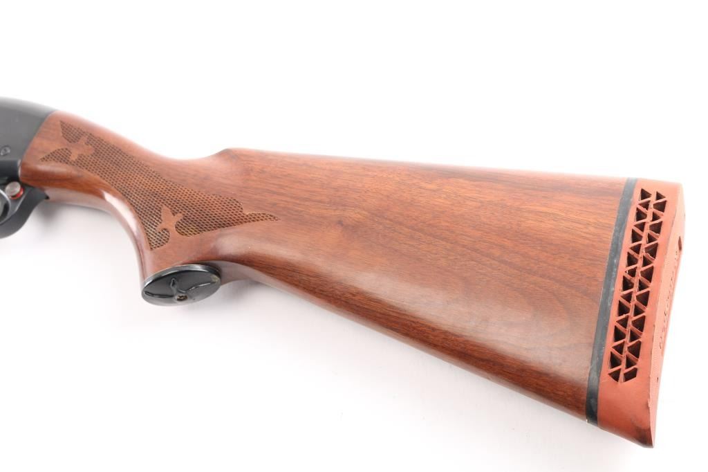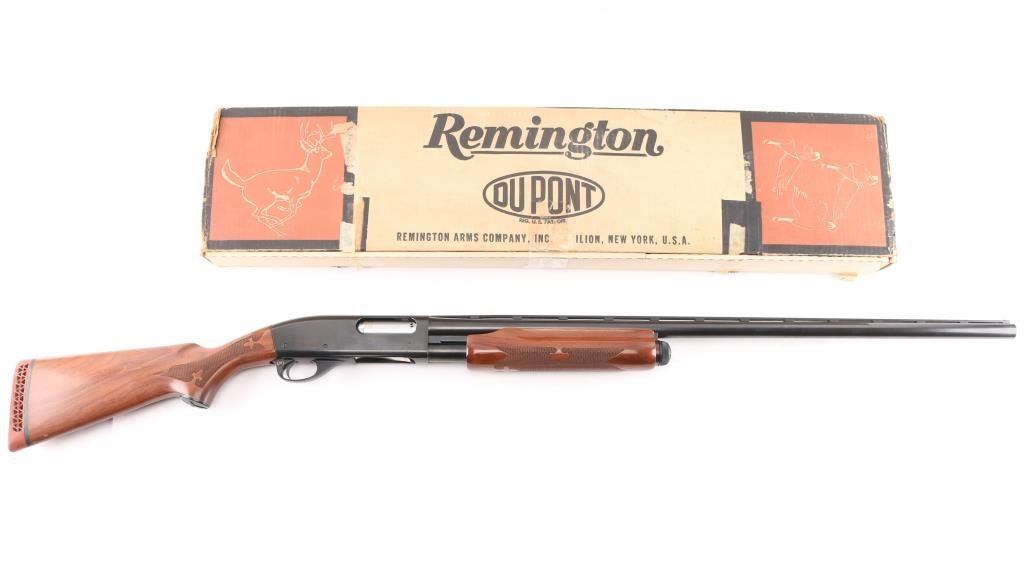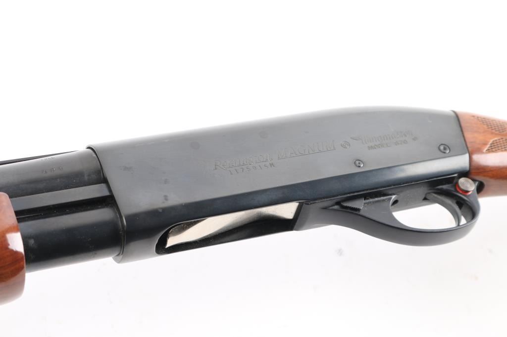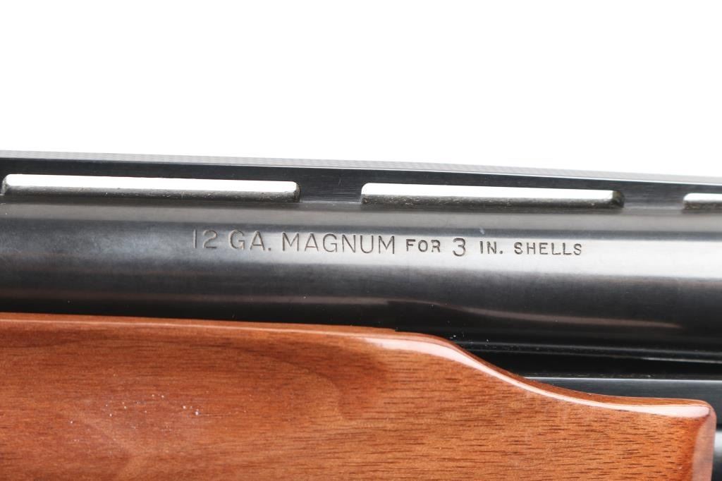 Sn: 1175915M. Remington magnum pump Action shotgun accepts 2 3/4" or 3" shells. Features 30" vent rib barrel, Full fixed choke, steel front bead, push button safety, blued finish, checkered wood pump handle, checkered wood semi-pistol grip shoulder stock with curved wrist, factory rubber recoil pad. 14" LOP. Bore is excellent/bright condition. Metal surfaces retain 99% blue. Wood stocks are excellent. Comes with original factory box with paperwork. Manufactured 1967.