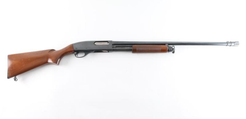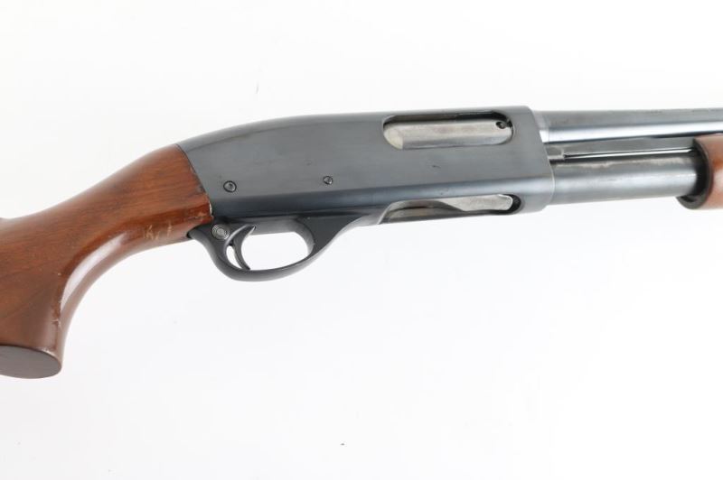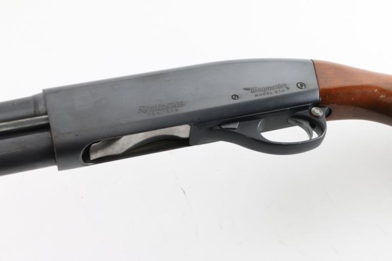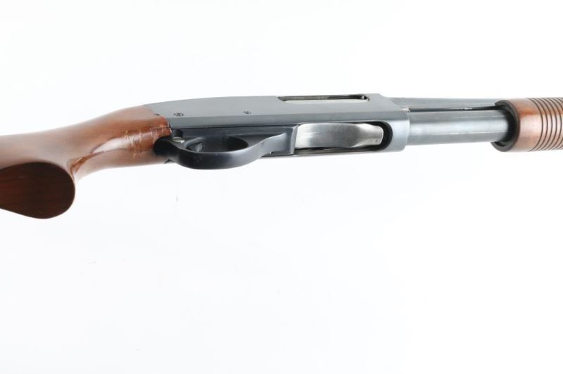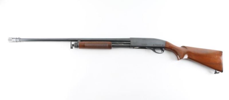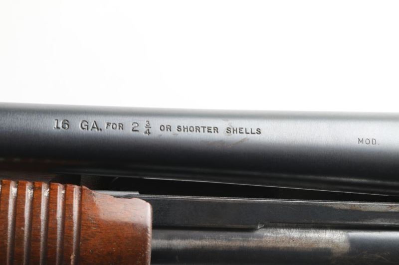 American made pump action shotgun chambered for 2.75" or shorter 16 gauge shells. This Remington 870 "Wingmaster" features a 27" (with choke) blued barrel and receiver with a brass bead front sight. smooth trigger and metal trigger guard. The barrel is marked Modified but a Herter's adjustable choke has been added to the muzzle. It has two piece wood stocks with a "corn cob" style forearm and plain shoulder stock with black Remington factory butt plate. Sling swivels are attached to the butt stock and mag tube cap. LOP is 14.25". Bore looks very good. Metal finish looks good but does show some signs of wear and handling. The wood forearm looks very good and the shoulder stock shows a little wear with a couple of dings and a very small crack and a chip where the wood meets the receiver on the right side. There is also a small chip in the toe of the butt plate. Condition is NRA Good+ **Modern Firearm**