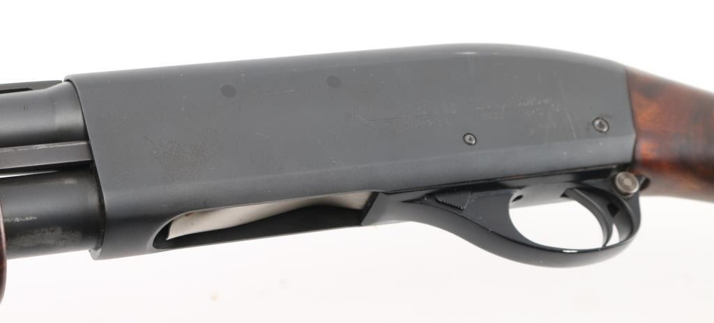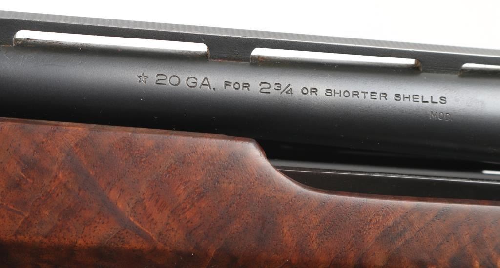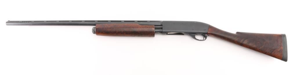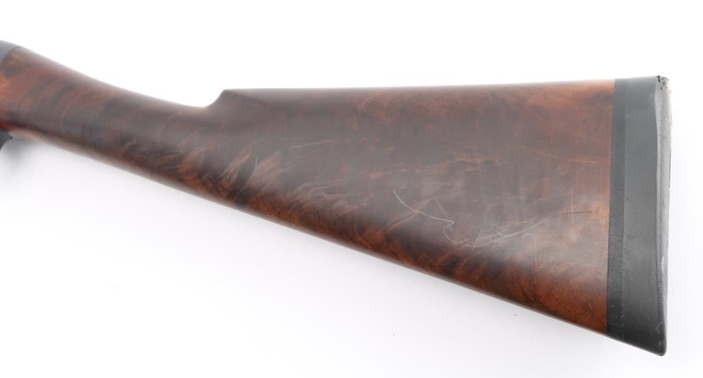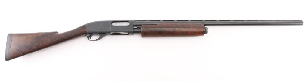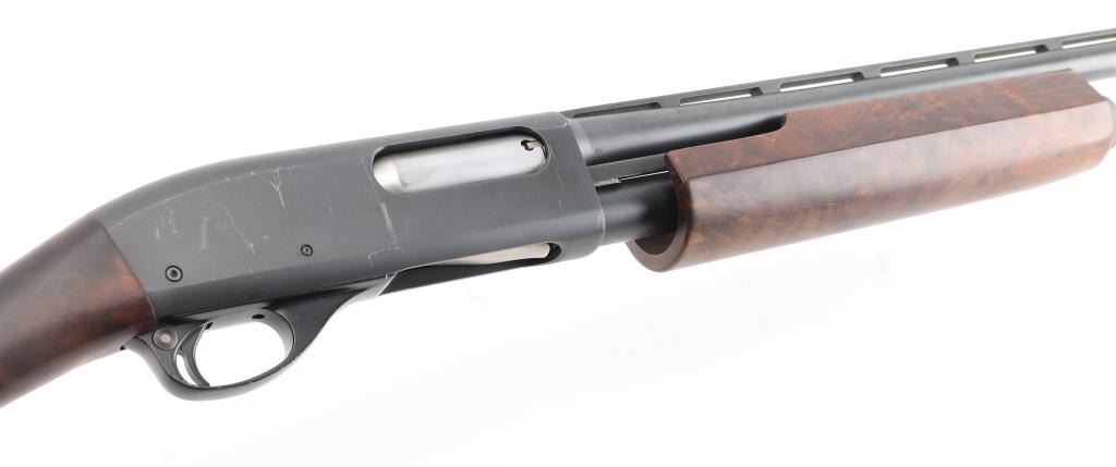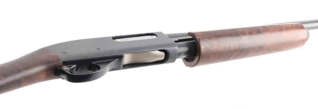 Customized pump Action shotgun accepts 2-3/4" or shorter shells. Features ported 28" vent rib barrel with fixed MOD choke, Bradley front sight with white polymer bead, steel mid bead, push button safety, matte blued finish, custom fancy figured smooth walnut straight wrist stock, custom matching pump handle, solid rubber recoil pad. 14" LoP. Bore is very good condition. Metal retains 90% bluing with edge losses, scratches on receiver, bare metal where action parts rub. Wood is dark walnut with fiddle grain across butt and pump handle, very good condition with handling marks, few scratches & dings. Custom work attributed to Gunsmith David Mazy of Arizona. Condition is near NRA Excellent as customized *** Modern Firearm ***