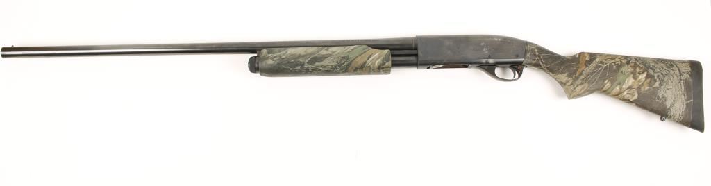 Pump-action shotgun with a manufacture date of 1955. Blued 29-1/2" 2-3/4" or shorter chambered full-choke barrel with minor surface rust on the right side. Bore is smooth and un-pitted. Receiver has some bluing loss on normal contact wear points and minor dings and external pitting. Bolt carrier and action are in good working condition. It has new polymer stock and foregrip in woodland laminate print. Comes with original 1953 instructions and care guide. Overall condition is Good. Modern Firearm