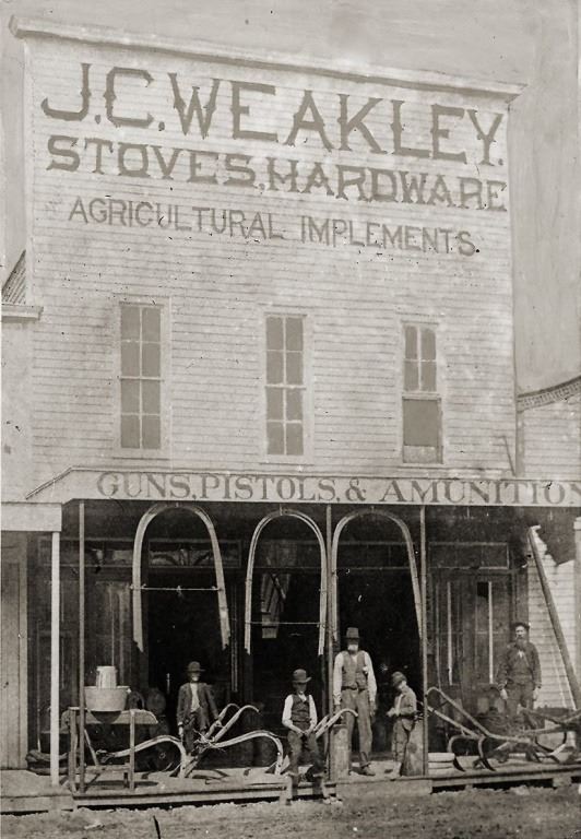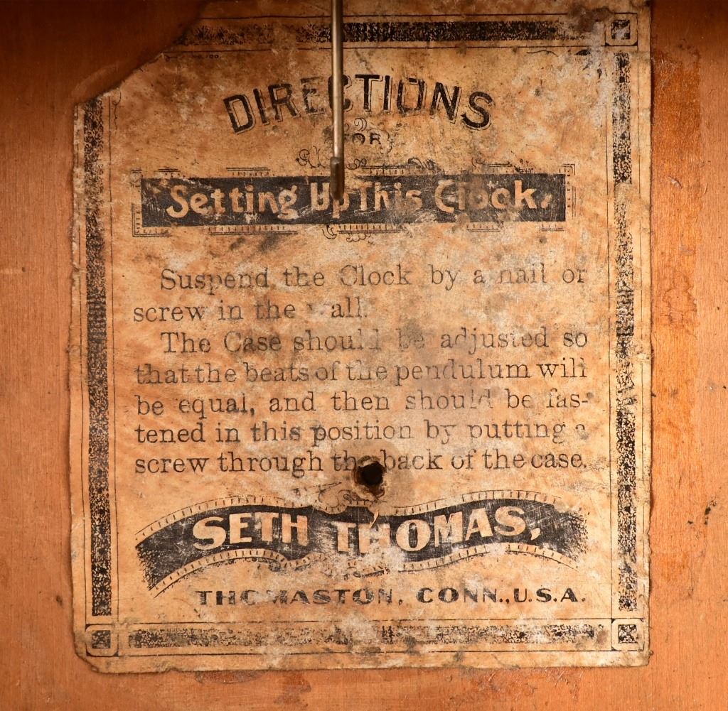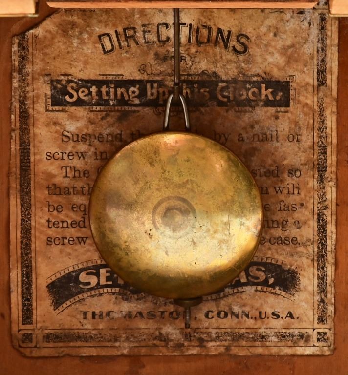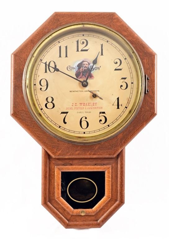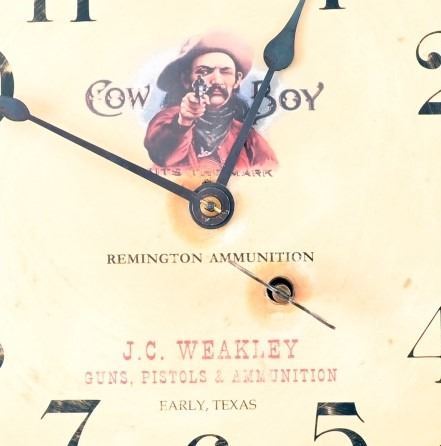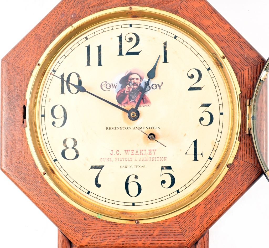 Manufactured by Seth Thomas, Remington Ammunition advertisement clock made for J.C. Weakley Hardware Store, Early, Texas. The store was formerly located in Brownwood, Texas and was owned by the same family for 5 generations - 140 years. (Antique photo shown is for reference only, from the internet). Working condition with key, winds counter-clockwise.