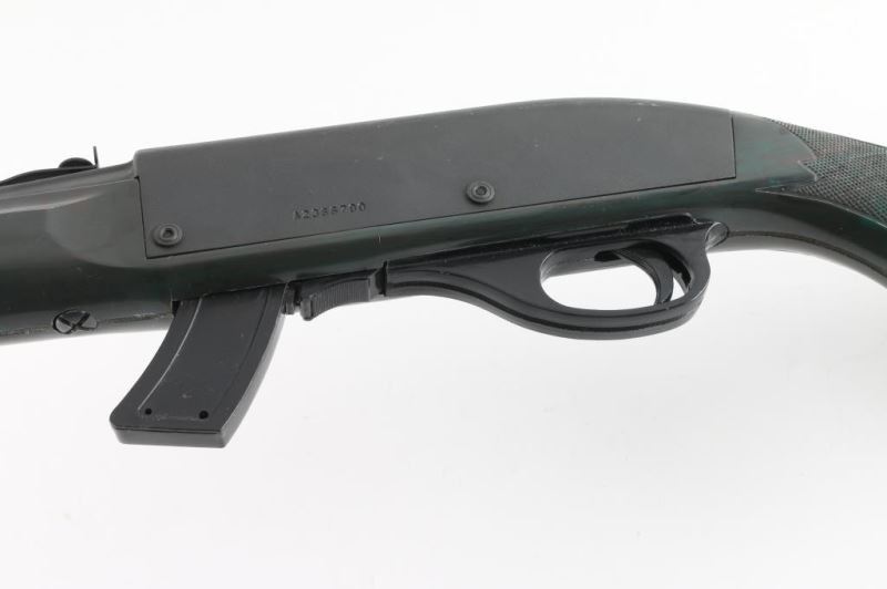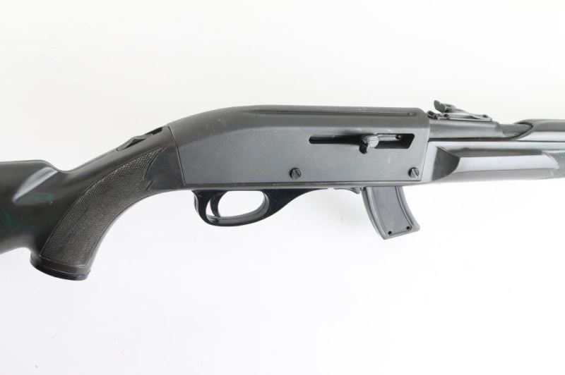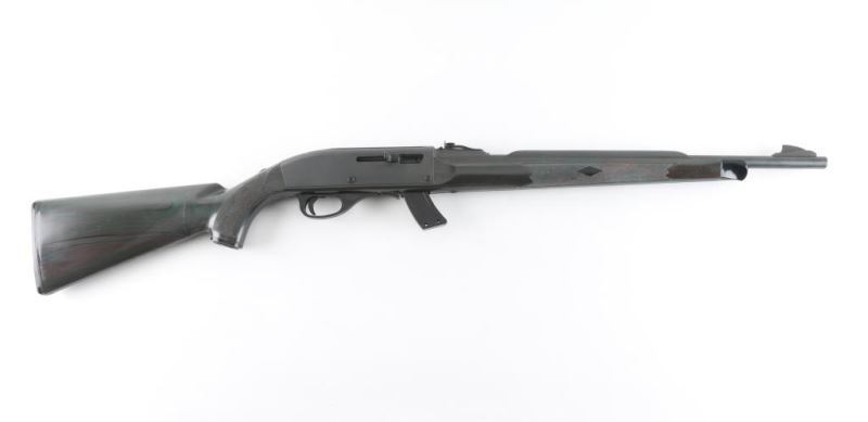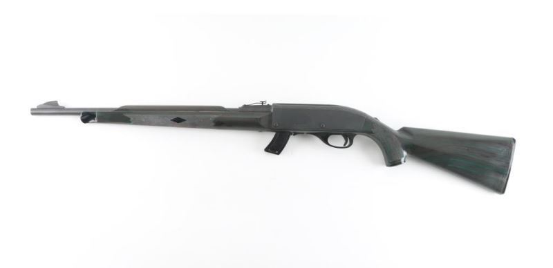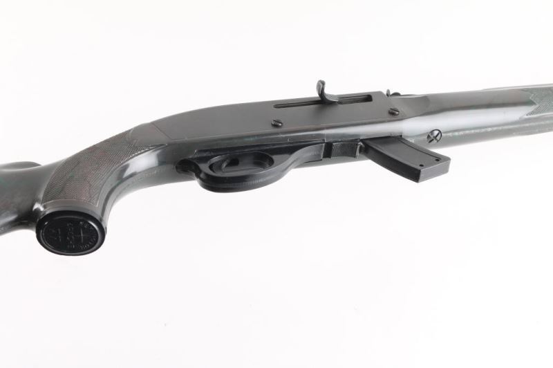 Magazine fed semi-automatic sporting rifle chambered in .22 Long Rifle, manufactured circa 1987-1989. Features a blued 19.5" barrel, blade font sight with, adjustable rear sight, detachable 6 round magazine, serrated trigger, sliding tang safety, matte black "teflon-like" finish on the receiver cover and checkered pistol grip green nylon stock with swirls of brown & black. Rifle retains approximately 99% of it's original blued finish. Action is smooth, the bore is good but needs cleaning, and the nylon stock is very good+ with scattered handling marks. Has a crack on the left buttstock. NRA Condition-Very Good. Modern firearm.
