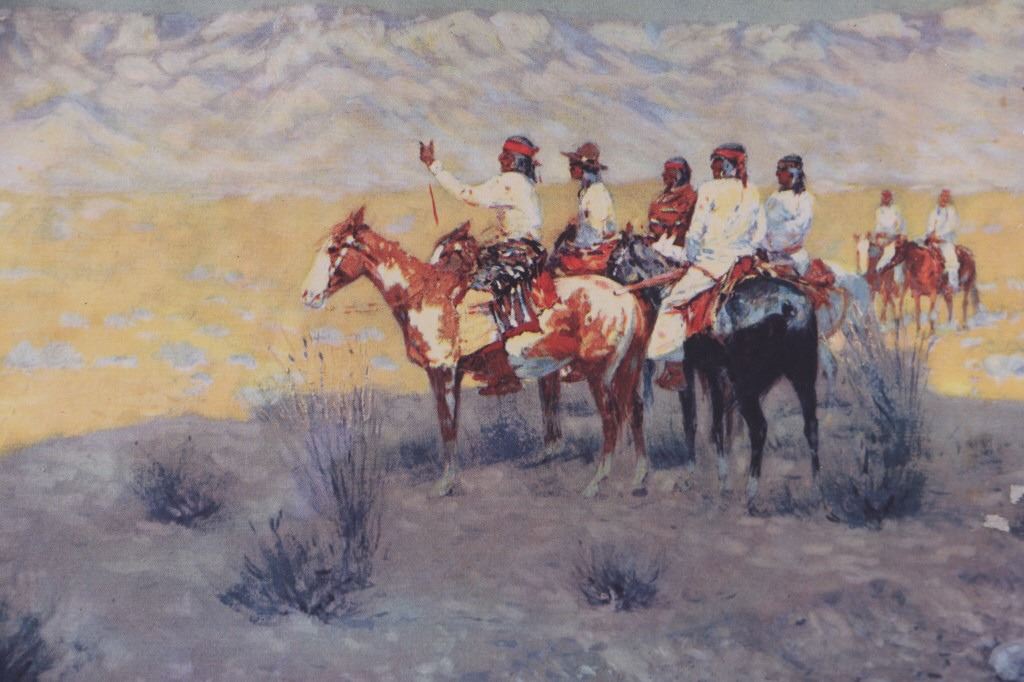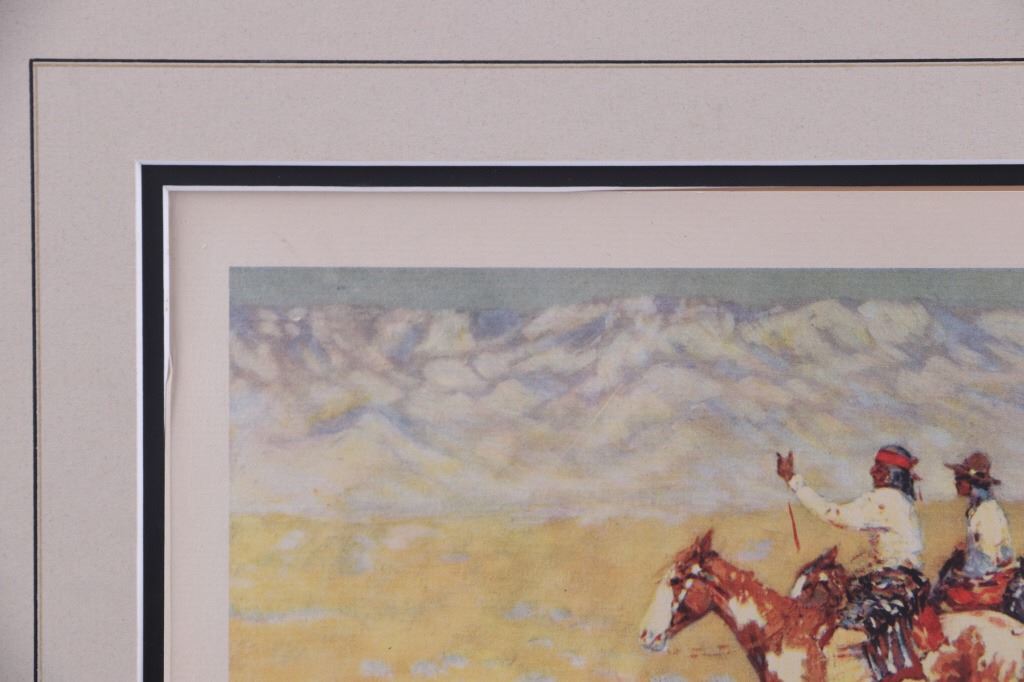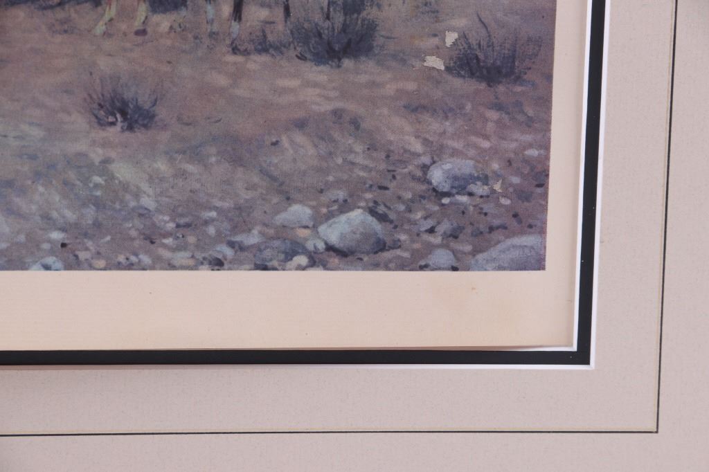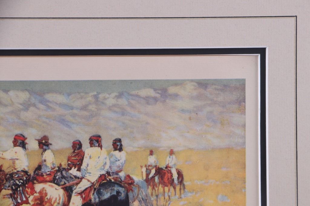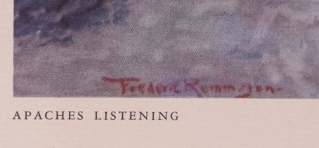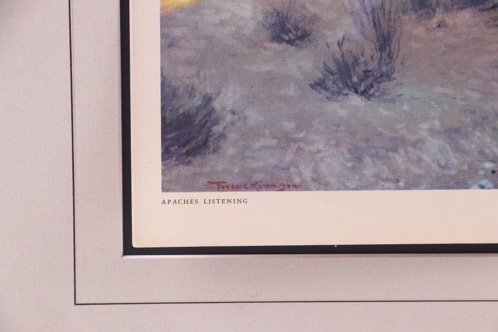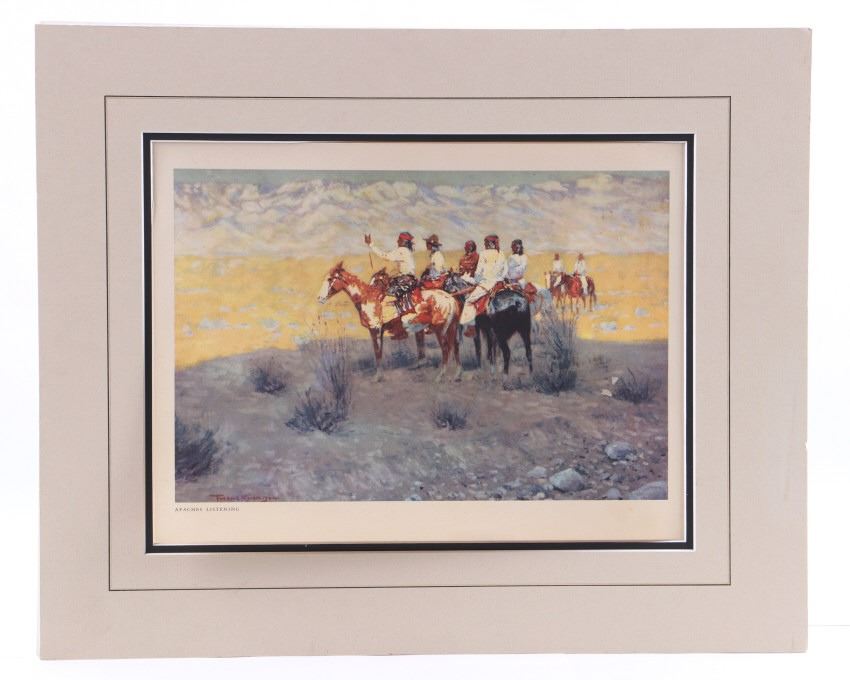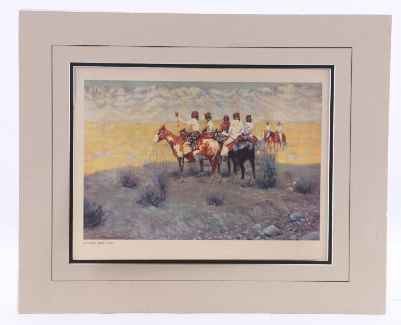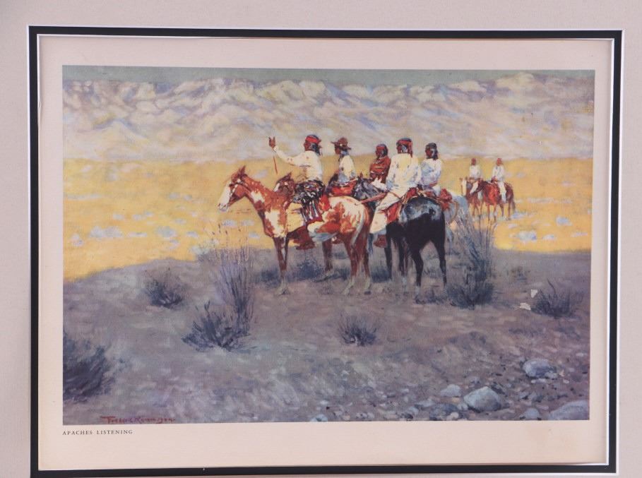 For your bidding pleasure in this lot is a Frederic Remington chromolithograph titled "Apaches Listening". This piece depicts a group of Apache Indians on horseback. One of the very special things about this particular Chromolithograph is how Remington has shown half the scene in shadow from the sun setting behind a hill behind the viewer. The Chromolithograph shows a printed signature of Remington in the bottom left corner. The chromolithograph is in a mat but slightly coming out. The art measures 11 3/4" x 8 3/4" in a mat that measures 17" x 14". This piece is in good overall condition.