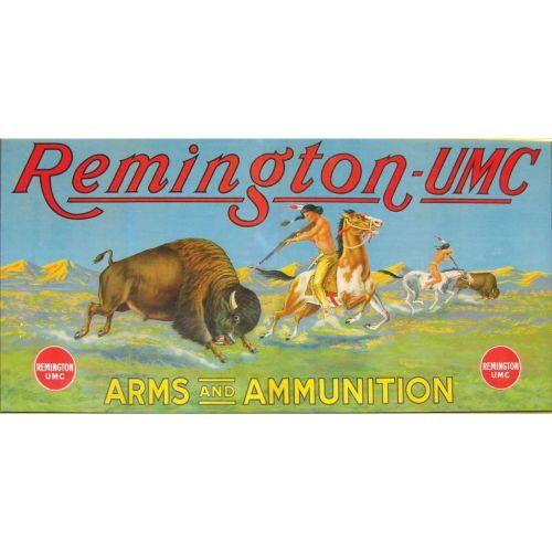 Very Rare Remington UMC Arms and Ammunition Canvas Banner. Depicts Native American shooting buffalo, excellent color and graphics. Framed in period oak. Excellent original condition. 55 1/4 X 28 1/4 inches.
