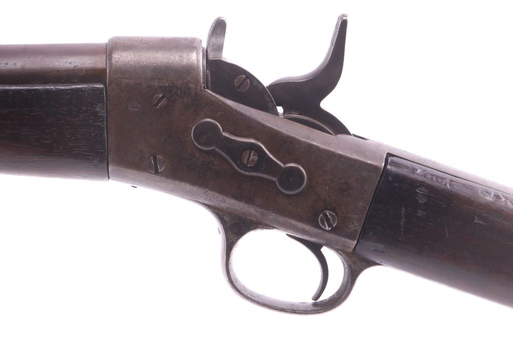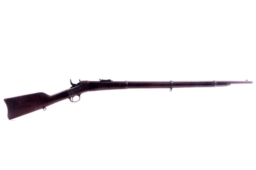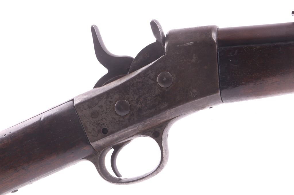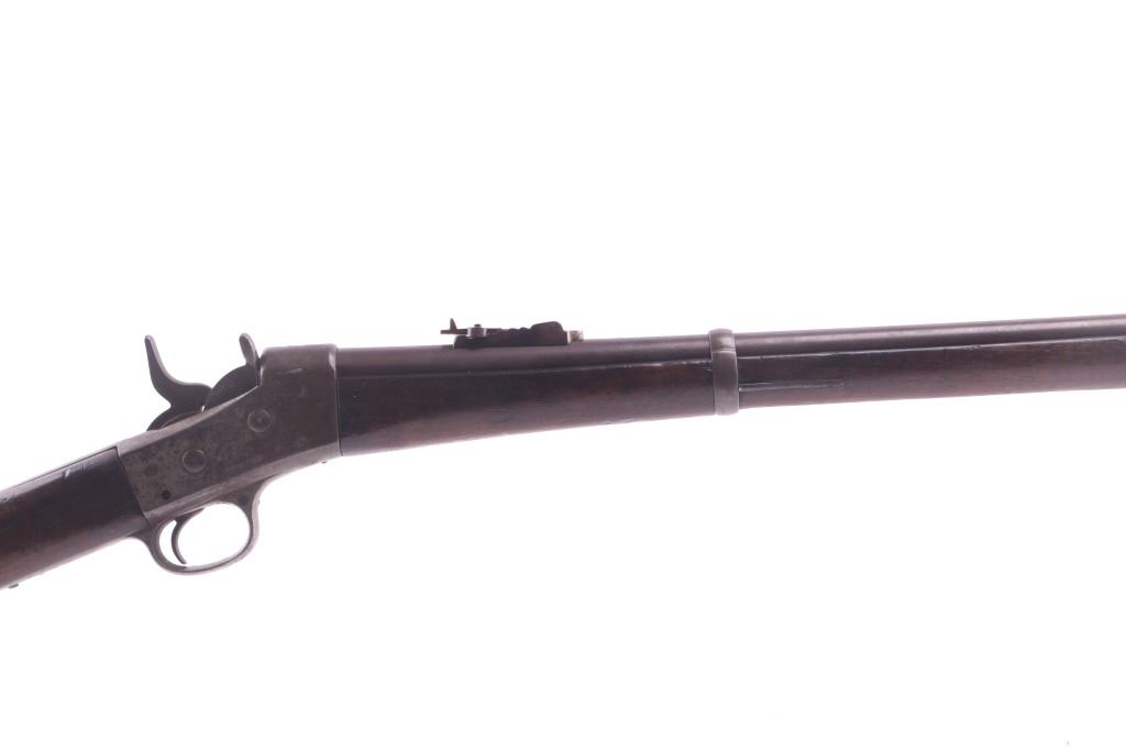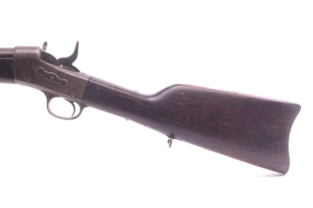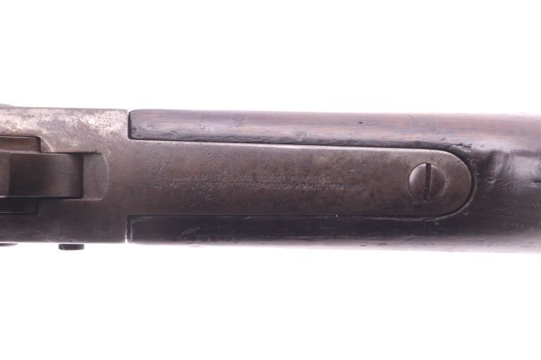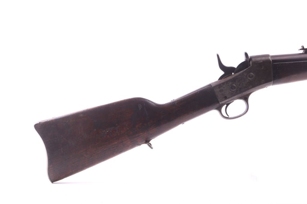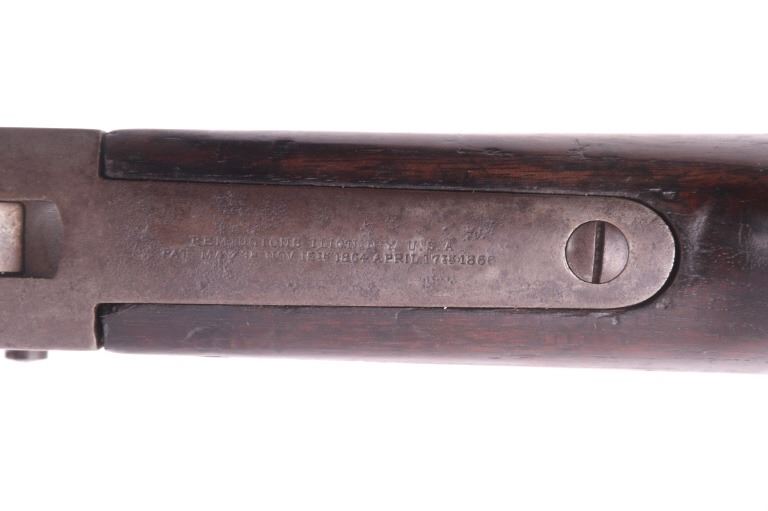 Featured in this lot is a Remington Arms Co rolling block rifle chambered in .45 caliber. The rifle displays a 35" long round barrel, rolling block action, blade front sight, adjustable rear sight, and walnut grip and stock. The rifle is marked on the top of the grip "REMINGTON ILION N.Y. U.S.A. PAT MAY 3D, NOV 15th 1864, APRIL 17th, 1866". The rifle displays light pitting across the barrel and wear on the wood due to age. The action shows good mechanical condition with a tight lock and snappy trigger and is missing its ram rod. Serial Number: NSN. This firearm qualifies as an Antique and does not require FFL Transfer or NICS Background Check.