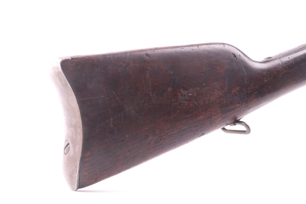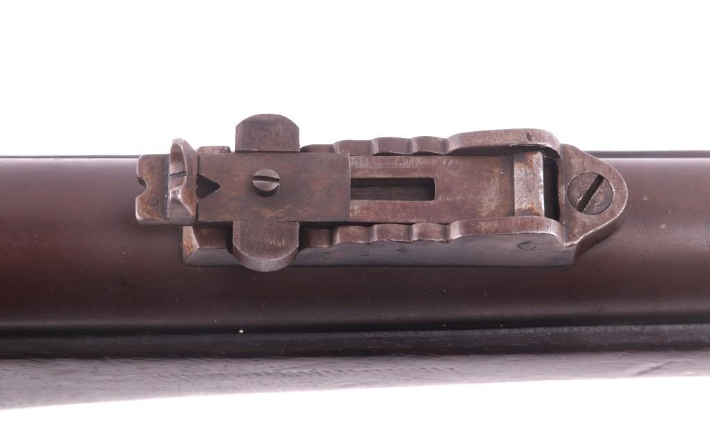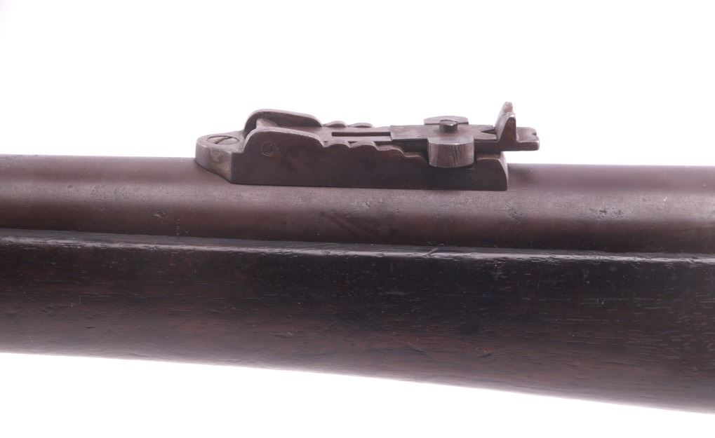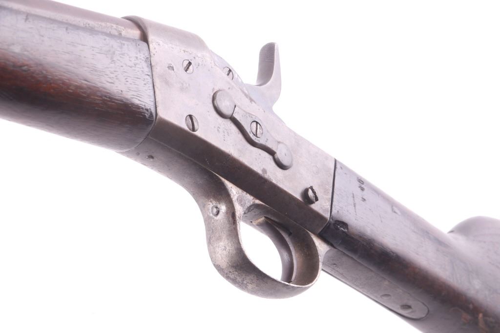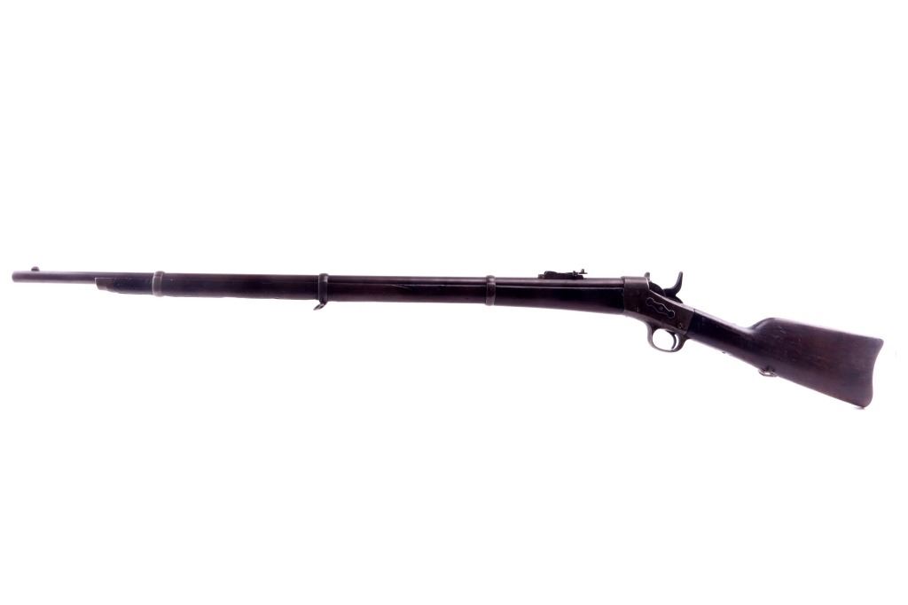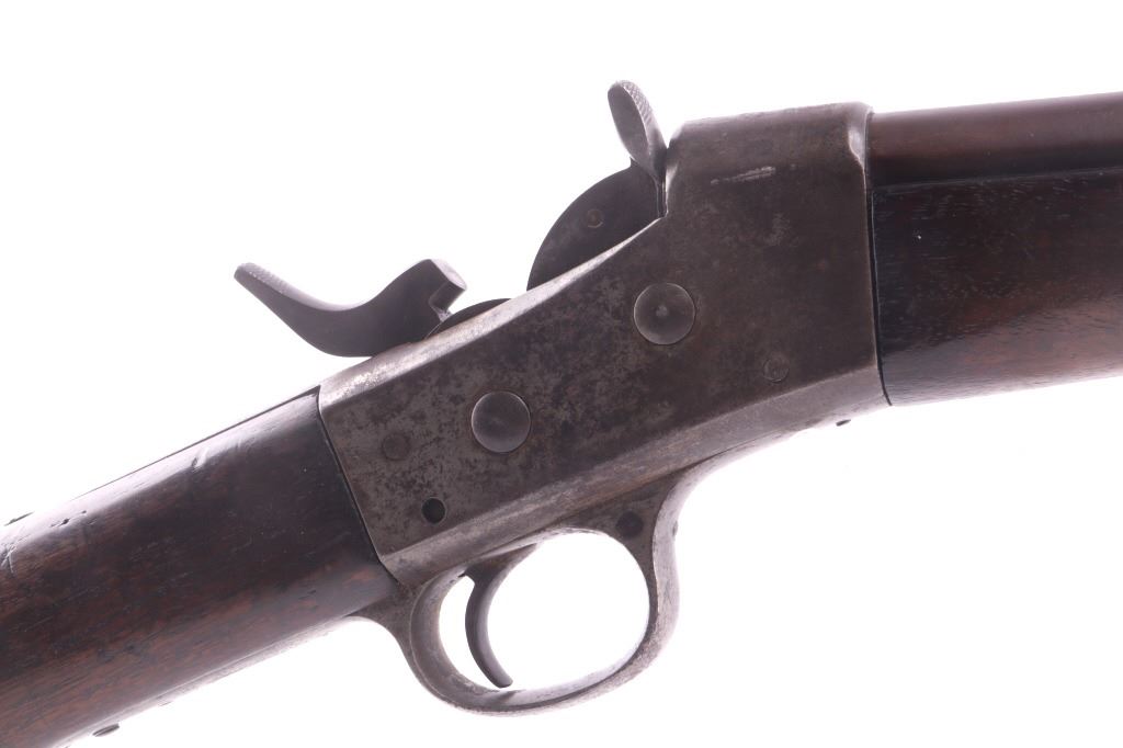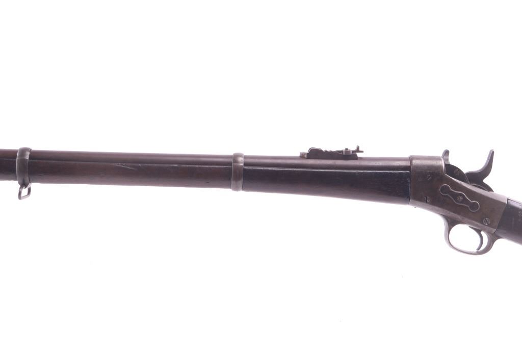 Featured in this lot is a Remington Arms Co rolling block rifle chambered in .45 caliber. The rifle displays a 35" long round barrel, rolling block action, blade front sight, adjustable rear sight, and walnut grip and stock. The rifle is marked on the top of the grip "REMINGTON ILION N.Y. U.S.A. PAT MAY 3D, NOV 15th 1864, APRIL 17th, 1866". The rifle displays light pitting across the barrel and wear on the wood due to age. The action shows good mechanical condition with a tight lock and snappy trigger and is missing its ram rod. Serial Number: NSN. This firearm qualifies as an Antique and does not require FFL Transfer or NICS Background Check.