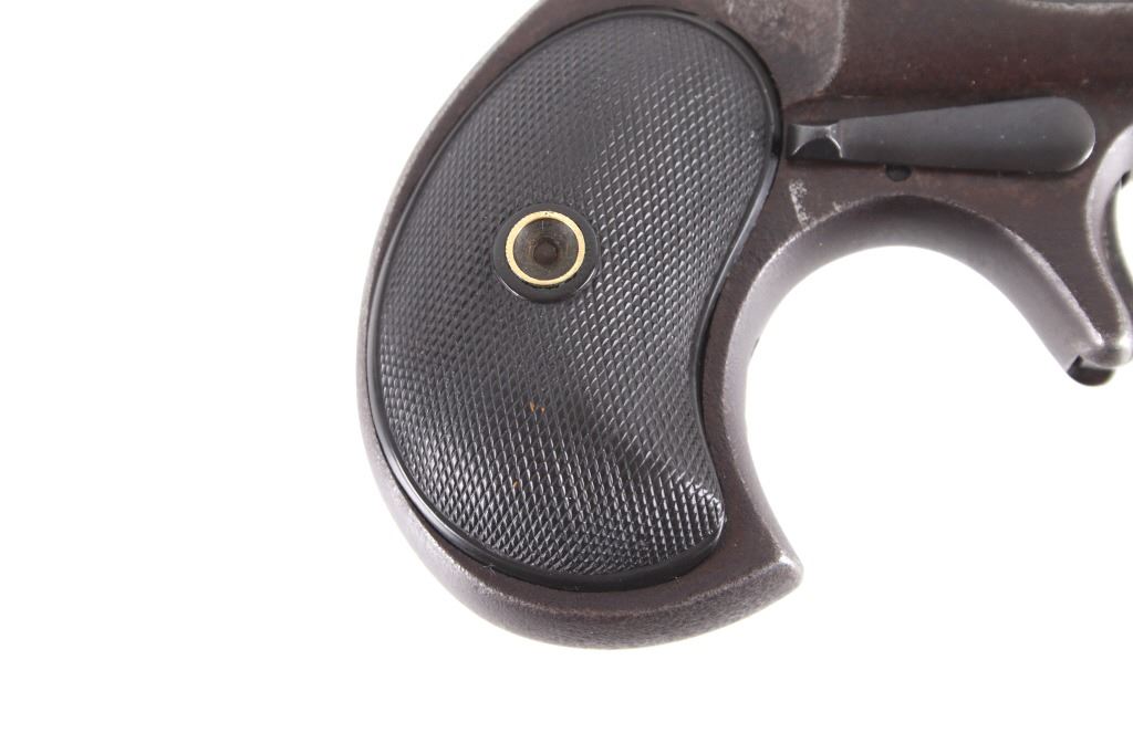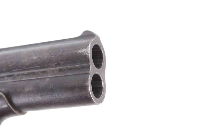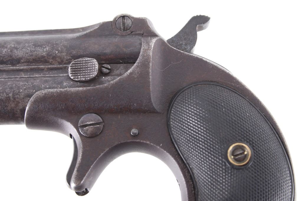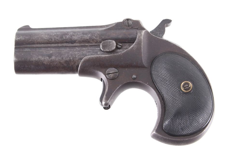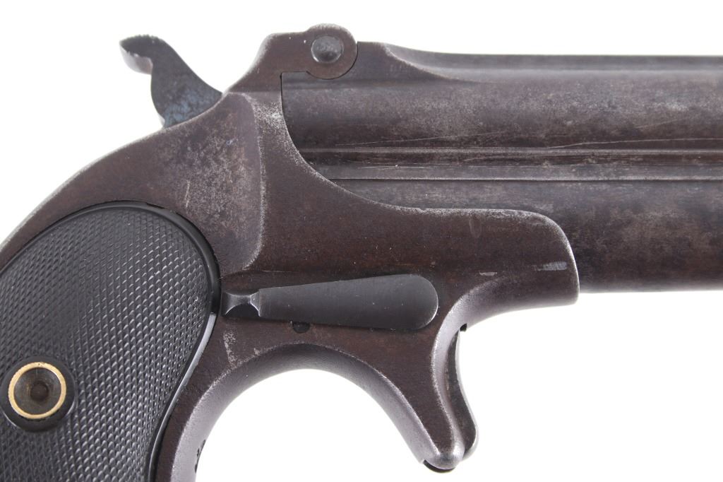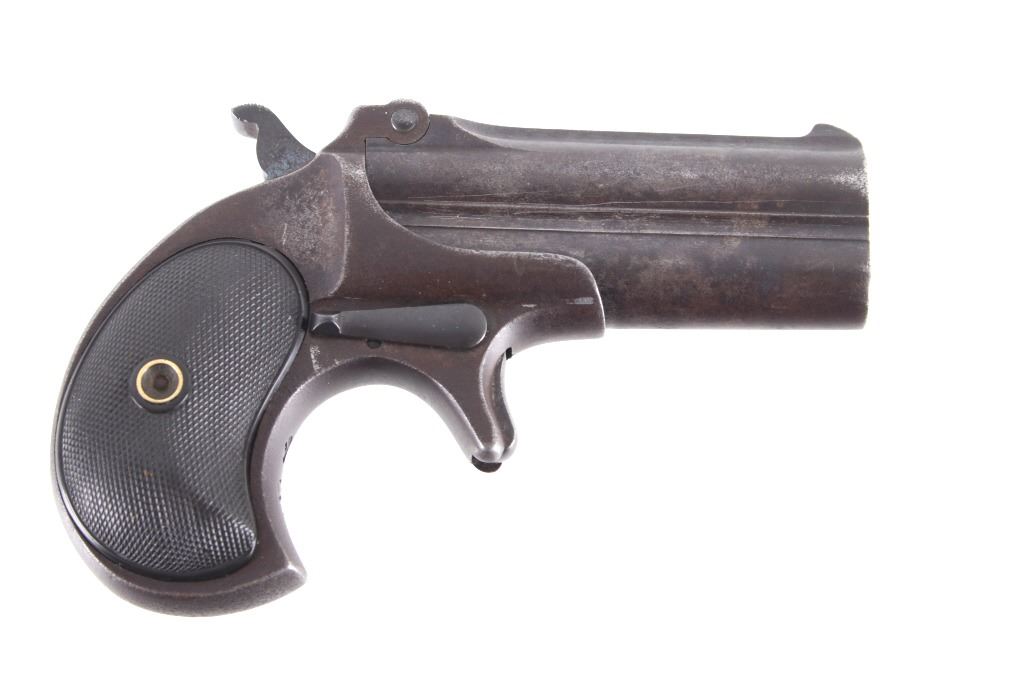 Featured in this lot we have a Remington Arms Type II O/U Derringer pistol chambered in the .41 rimfire caliber. This Remington 1866 Derringer Type II was manufactured between 1888-1911 by Remington. The Remington 1866 was later given a model designation in the early 1920's and were later designated as Model 95's. The Remington Double Derringer was one of the most iconic pocket hide-out weapons in American history, the Remington Double Derringer was chambered for the short .41 Rim Fire. This pistol displays two 3" barrels, compact frame, spur trigger, and hard rubber grips. The barrels were locked in place for firing by a rotating lever on the right side of the frame. The firing pin alternated from top barrel t bottom barrel automatically. The barrel is marked across the top rib reading "REMINGTON ARMS CO. ILION, N.Y.". The pistol shows good condition overall for its age with functional mechanics. The derringer weighs 10oz. Serial Number: 222. This firearm qualifies as a Curio & Relic firearm, and requires FFL Transfer or NICS Background Check.