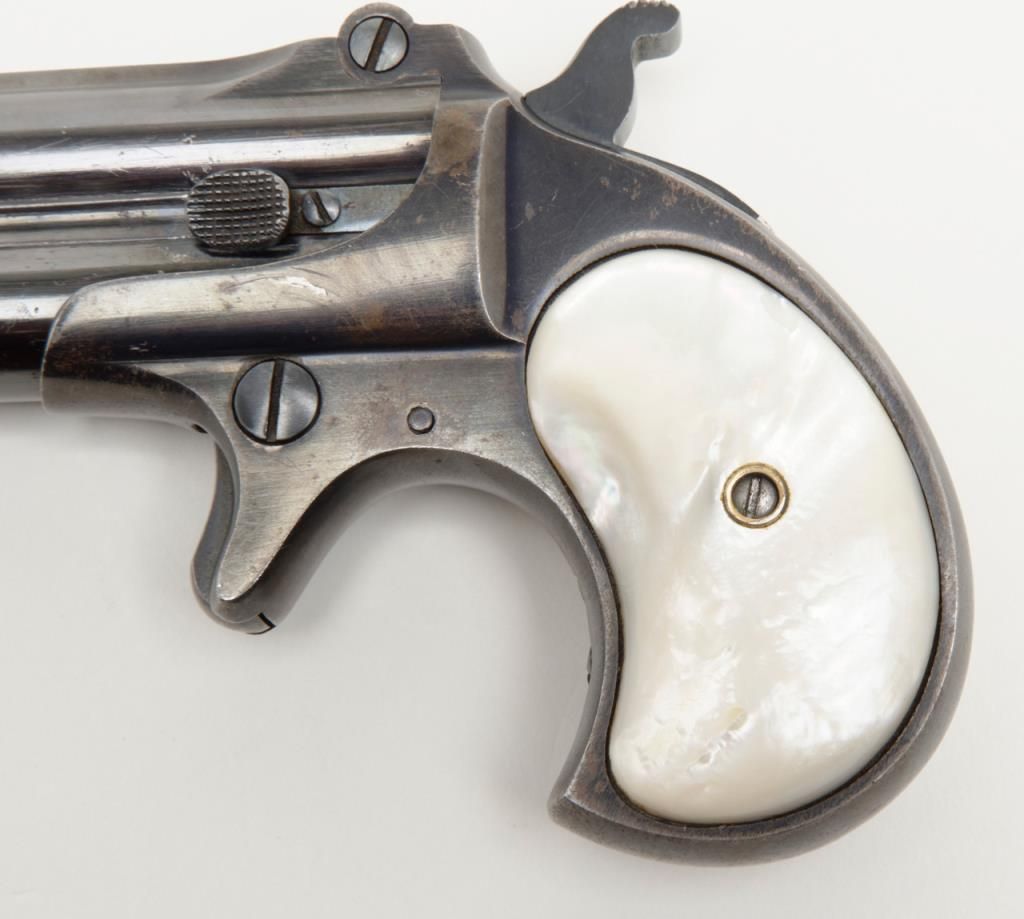 Remington Arms-UMC Double Derringer, .41 cal., 3” barrels, blue finish, pearl grips, #99 in overall fine to excellent condition showing the majority of its bright original blue finish, fine bores, crisp action, sharp markings and fine iridescentpearl grips. (Antique). Est.: $900-$1,800.