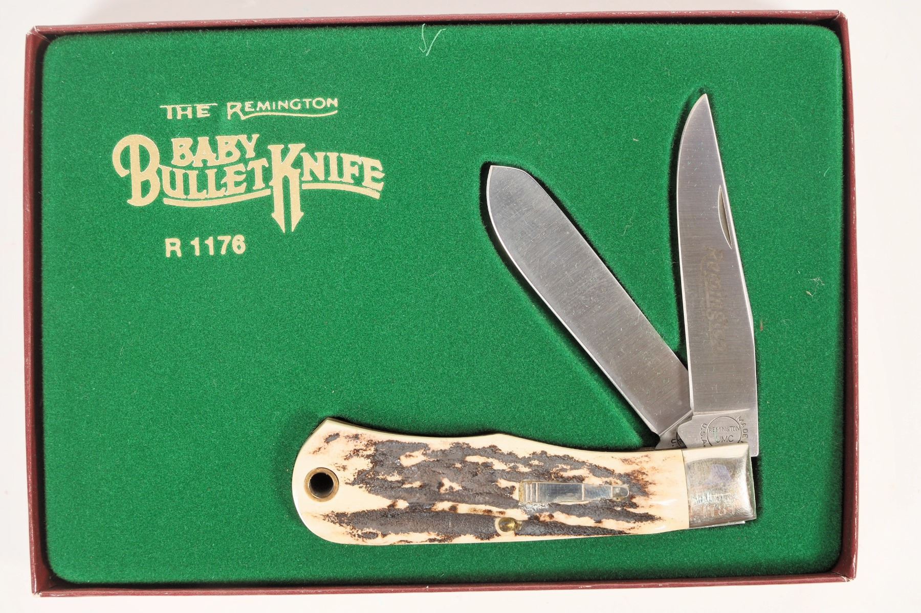 This is a like new Remington Baby Bullet knife Model R1176 with box; S/N 1781. The knife is the trapper design with beautiful jigged antler scales and the bullet inlay. A hunting scene on the box depicts four hunters recovering from a canoe incident followed by a Mother Grizzly and her two cubs. From the Lightfoot collection. Please see photo for details.