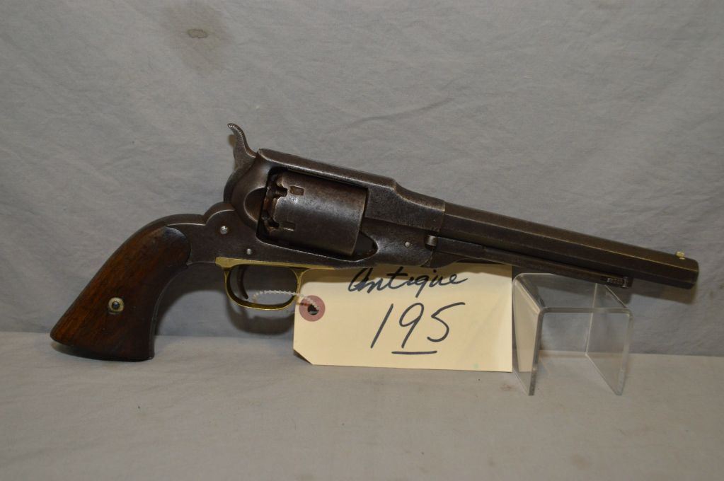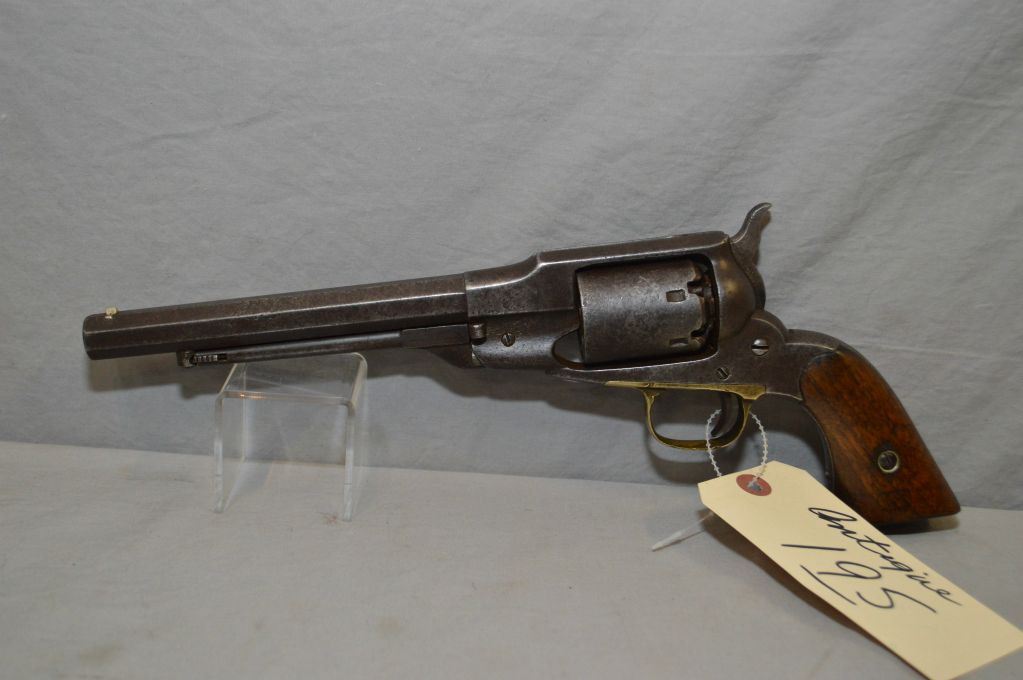 Remington - Beals Model Navy .36 Perc Cal 6 Shot Revolver w/ 7 1/2" octagon bbl [ blued finish turned brown with some light pitting, walnut grips with Inspector cartouche on left, both have very small chips by front strap, brass trigger guard, barrel marked "Beals' Patent. Sept. 14.1858 Manufactured by Remingtons ILION N.Y.", barrel & frame stamped with a C left side, possibly Marshall marked , as cartouche on grip, approx. only 400 - 500 were sold to the U.S. Army, specimens were scarce, most were in serial number range 13,000 - 15,000, Circa 1861 - 1862, Total Production Estimate 14,500 ] Ser # 14715 ANTIQUE NO PAL REQ