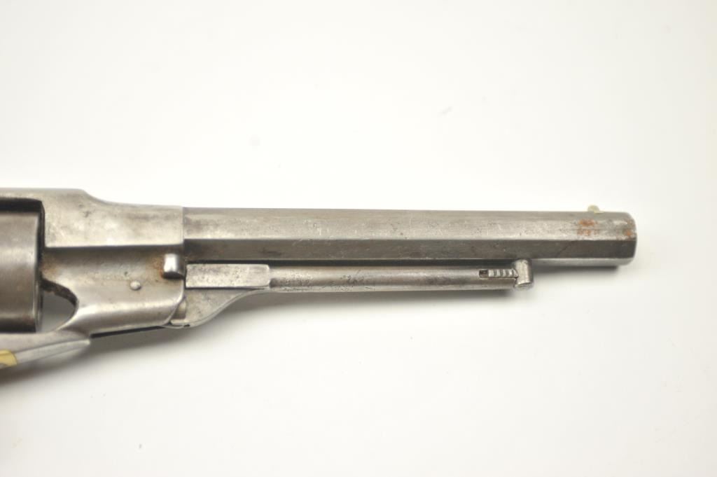 Remington Beals Navy percussion revolver, .36  caliber, Serial #9757.  The pistol is in  good overall condition with an 8” octagon  barrel with faint traces of original blue in  the protected areas and a brass triggerguard.  The smooth wood grips are in good  condition with an old brass diamond in the  grip.  The action is not working at the time  of description.  Est.:  $700-$1,400.   (Antique).