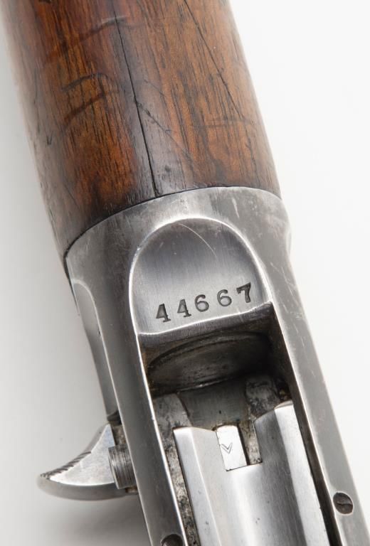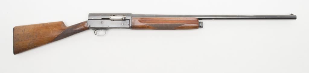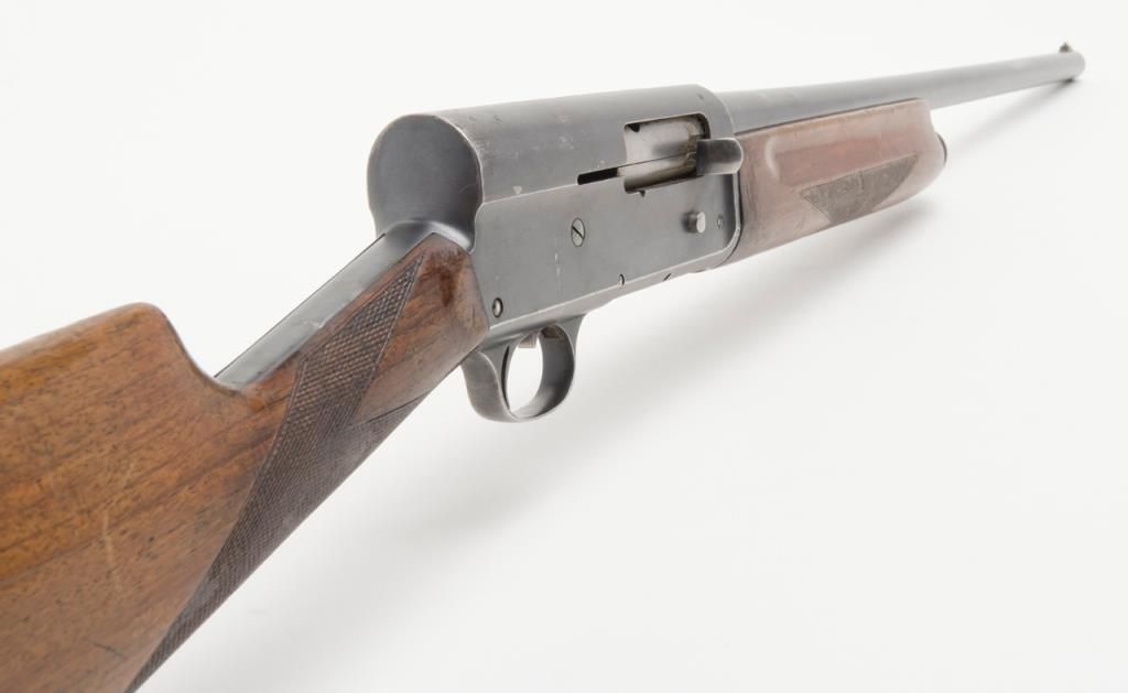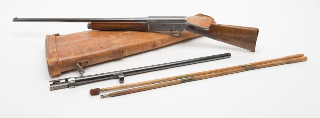 Remington Browning’s Patent pre-Model 11 semi-auto shotgun, 12 gauge with 2 barrels, one is a 28” full choke, the other is a 28” modified choke, blue finish, checkered wood stocks with Remington black plastic butt plate, #44667 in overall goodto very good condition showing considerable muted blue finish, crisp action, very good bores and good wood with scattered old mars and scratches from carry and storage including an old approx. 1-1/4” crack on the underside of the forend atcenter emitting from the front of the frame; the shotgun is accompanied by a leather mutton carry case in well-worn condition. (C&R). Est.: $275-$450.