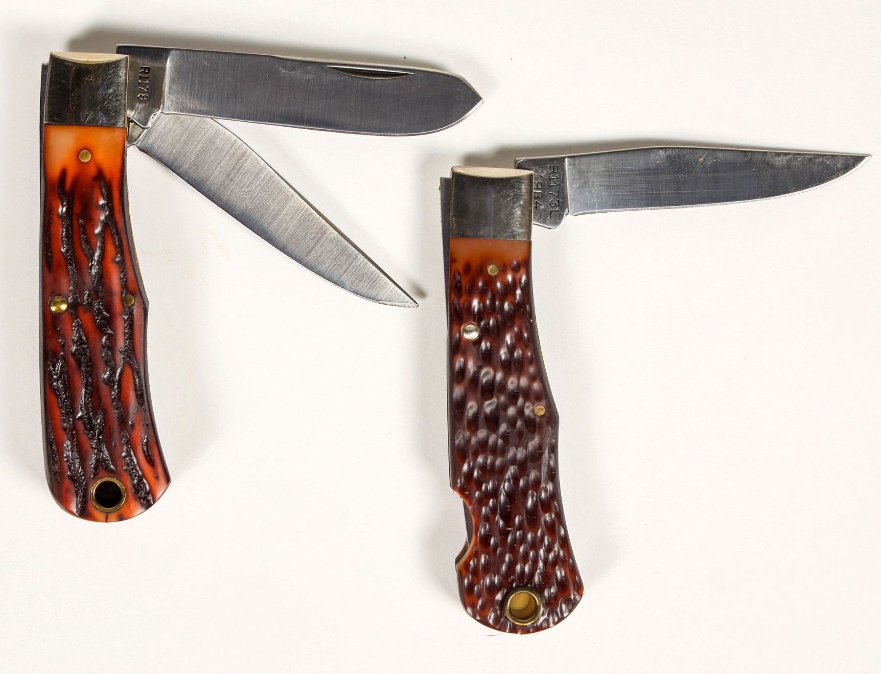 There are two Remington Bullet knives in this lot; the R 1178 Mini-Trapper and the R 1178 Lockback both of 1991. New with boxes. The R1178 is suffering from a crack in the scales on one side at the lanyard hole. Please see photo for details.