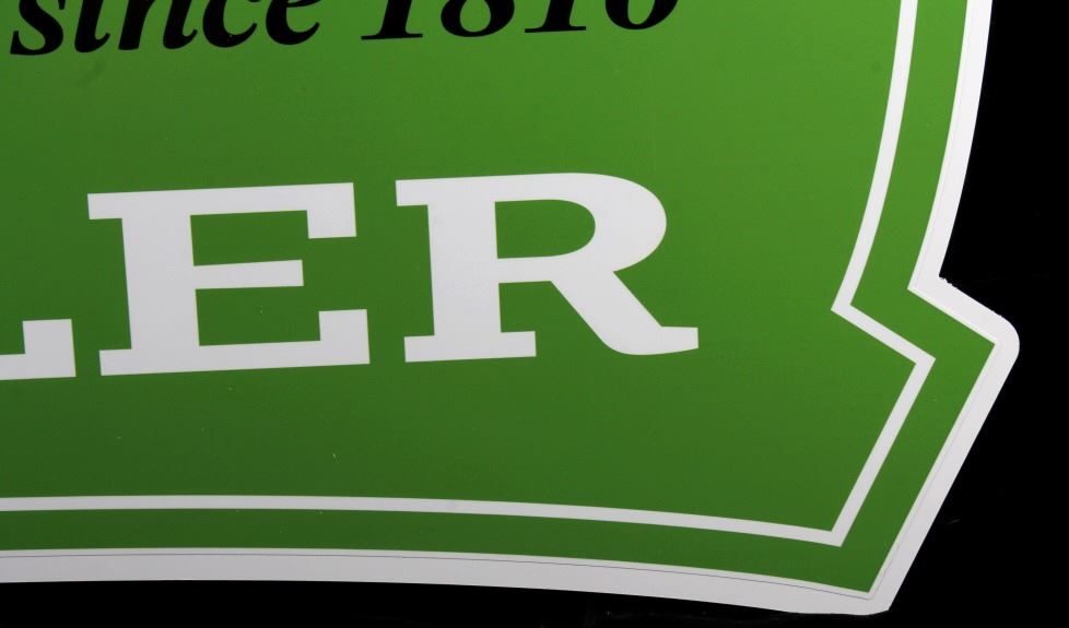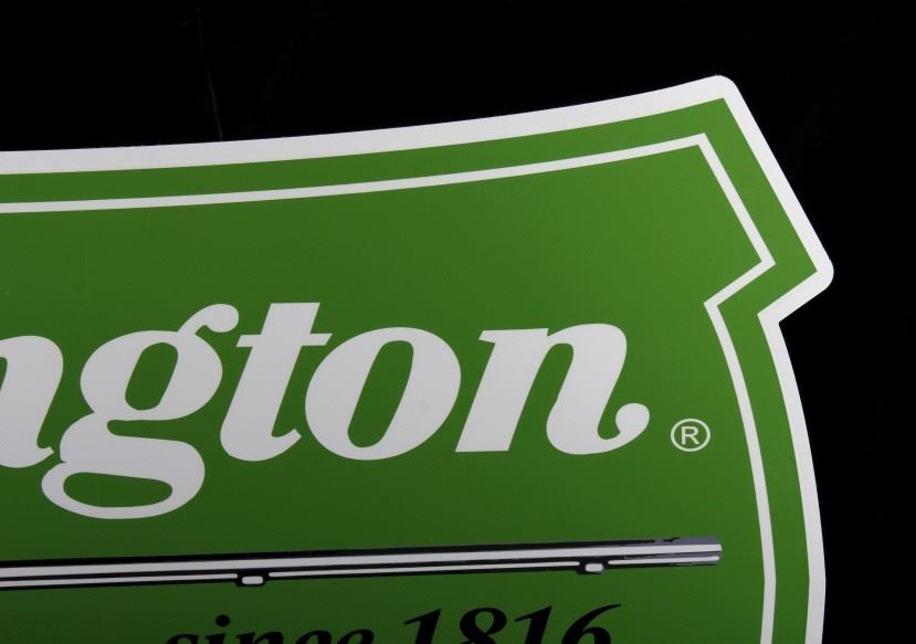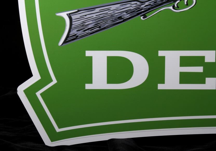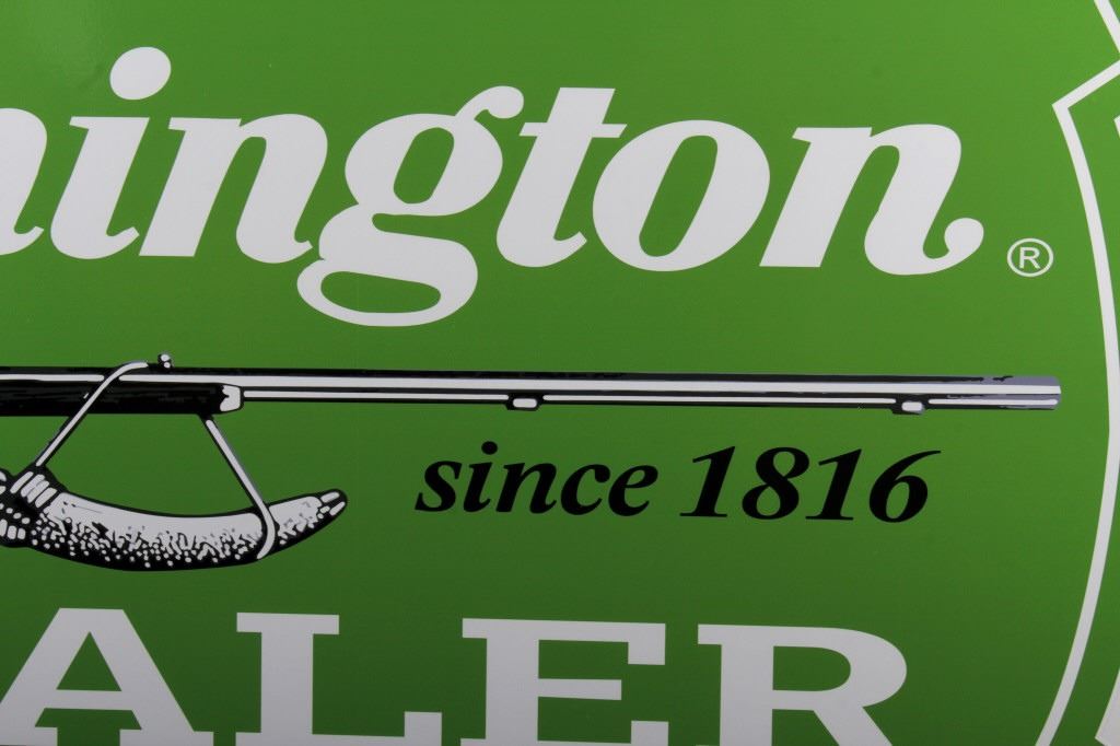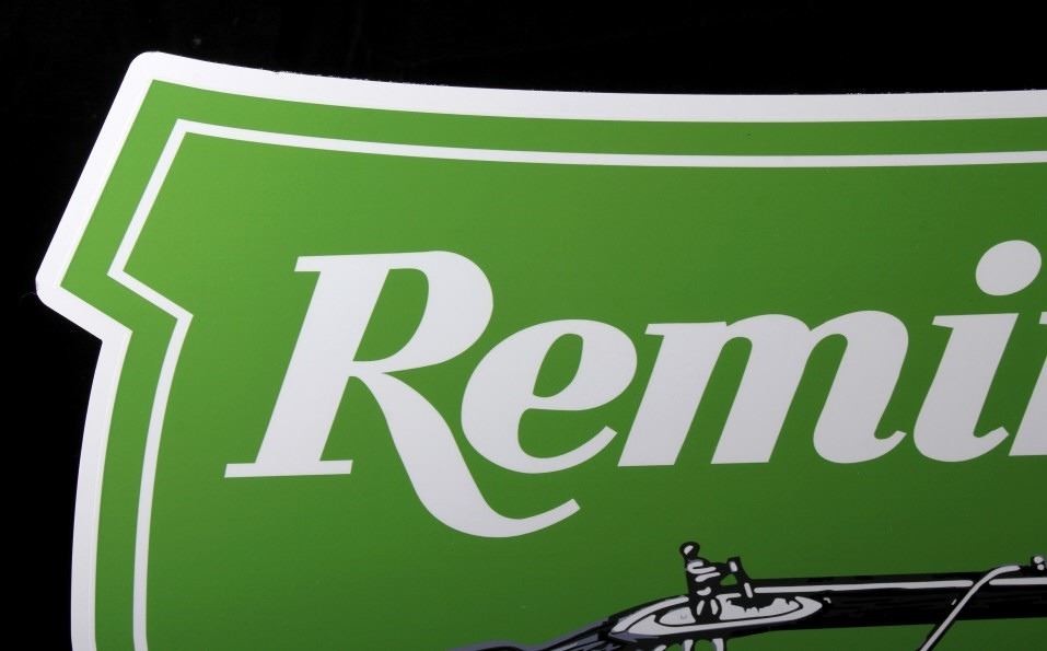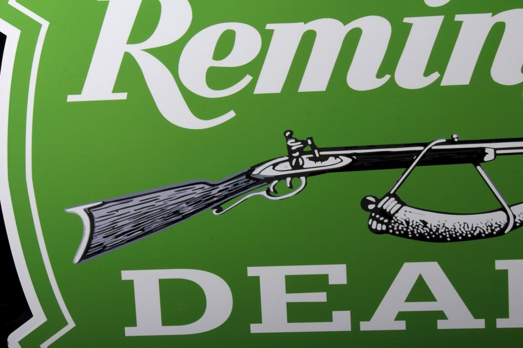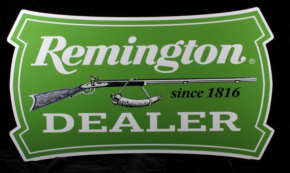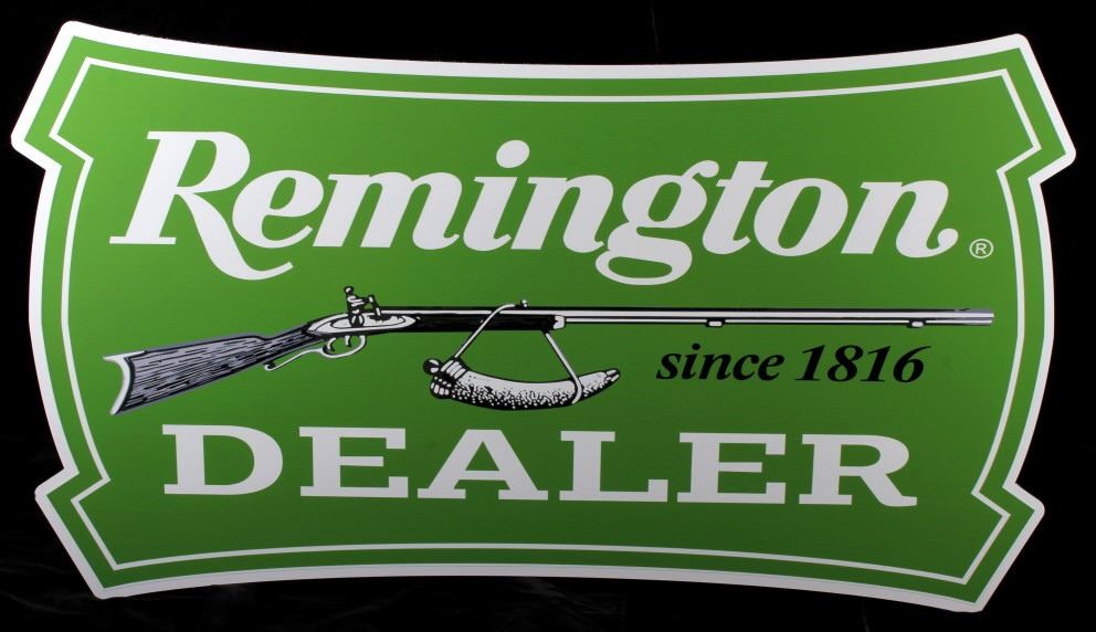Offered in this lot we have a Remington dealer advertising sign. The sign shows a primarily green background with a Remington black powder rifle and horn. The sign reads "Remington - Since 1816 - Dealer". The is modern sign is in good condition overall. The sign measures 36" long by 21" tall.