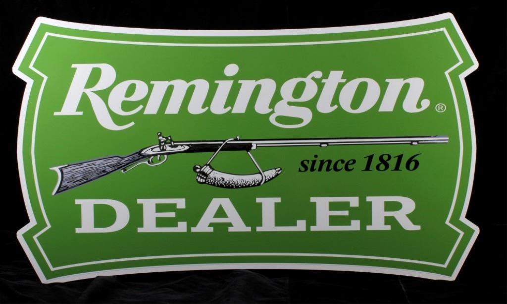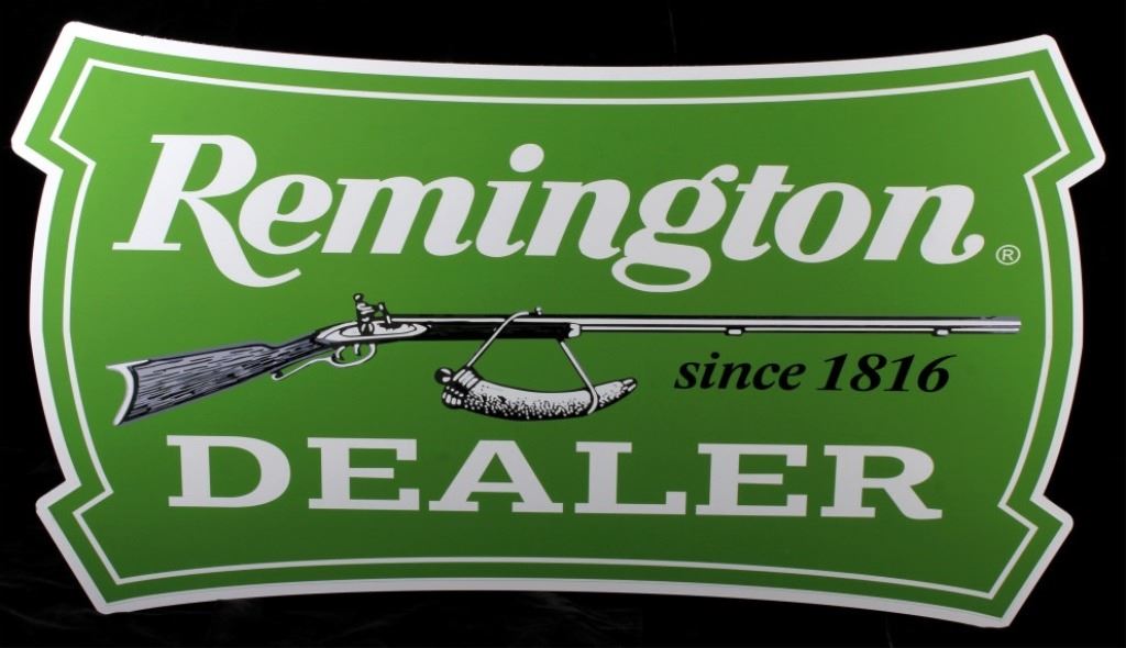Offered in this lot we have a Remington dealer advertising sign. The sign shows a primarily green background with a Remington black powder rifle and horn. The sign reads "Remington - Since 1816 - Dealer". The is modern sign is in good condition overall. The sign measures 36 1/2" long by 25" tall.