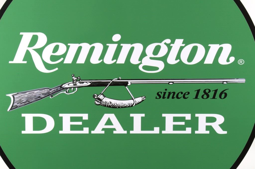 Offered in this lot we have a Remington dealer advertising sign. The sign shows a primarily green background with a Remington black powder rifle and horn. The sign reads "Remington - Since 1816 - Dealer". The is modern sign is in good condition overall. The sign measures 30" in diameter