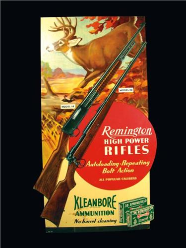 Remington Die Cut Cardboard Sign with easel back. Depicting a deer. Nail hole at top, some minor staining at bottom and slight crease on rifle butt otherwise excellent condition. 17 X 29 inches.