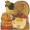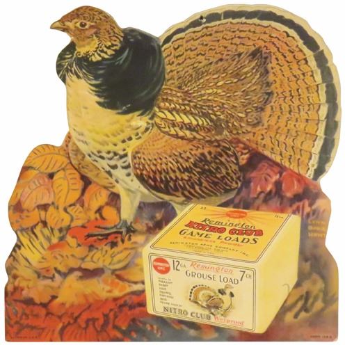 Remington Die Cut Cardboard String Hanging Easel Back Sign. Depicting Grouse by artist Lynne Bogue Hunt. Excellent condition. 10 1/2 X 10 1/2 inches.