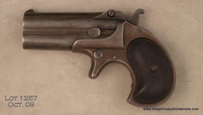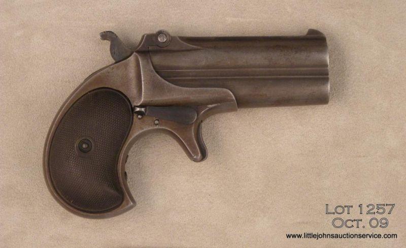 Remington Double Derringer Type 2 #252 .41 cal. 3” bbls, little blued finish remains. Mars on the left side of barrel, light pitting; nice checkered hard rubber grips. Good condition. Est. $200-$500.