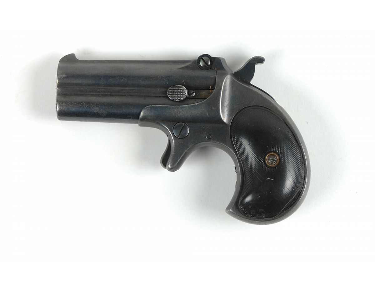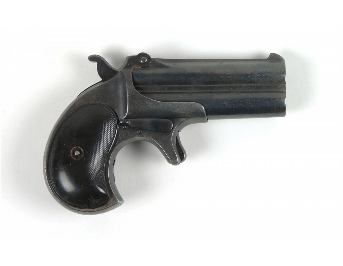 #482, cal. .41 rimfire. This is a Type II pistol with the one line barrel address “Remington Arms Co. Ilion, N. Y.” The hinge has been professionally repaired. 3? barrels, the bores with worn rifling and light pitting. The metal retains about all of an old reblue over some pinprick pitting; the factory lettering is good. The original checkered hard rubber grips show much wear with a small sliver missing from the rear of the left grip. The first hammer notch is worn, and the metal has matching numbers.