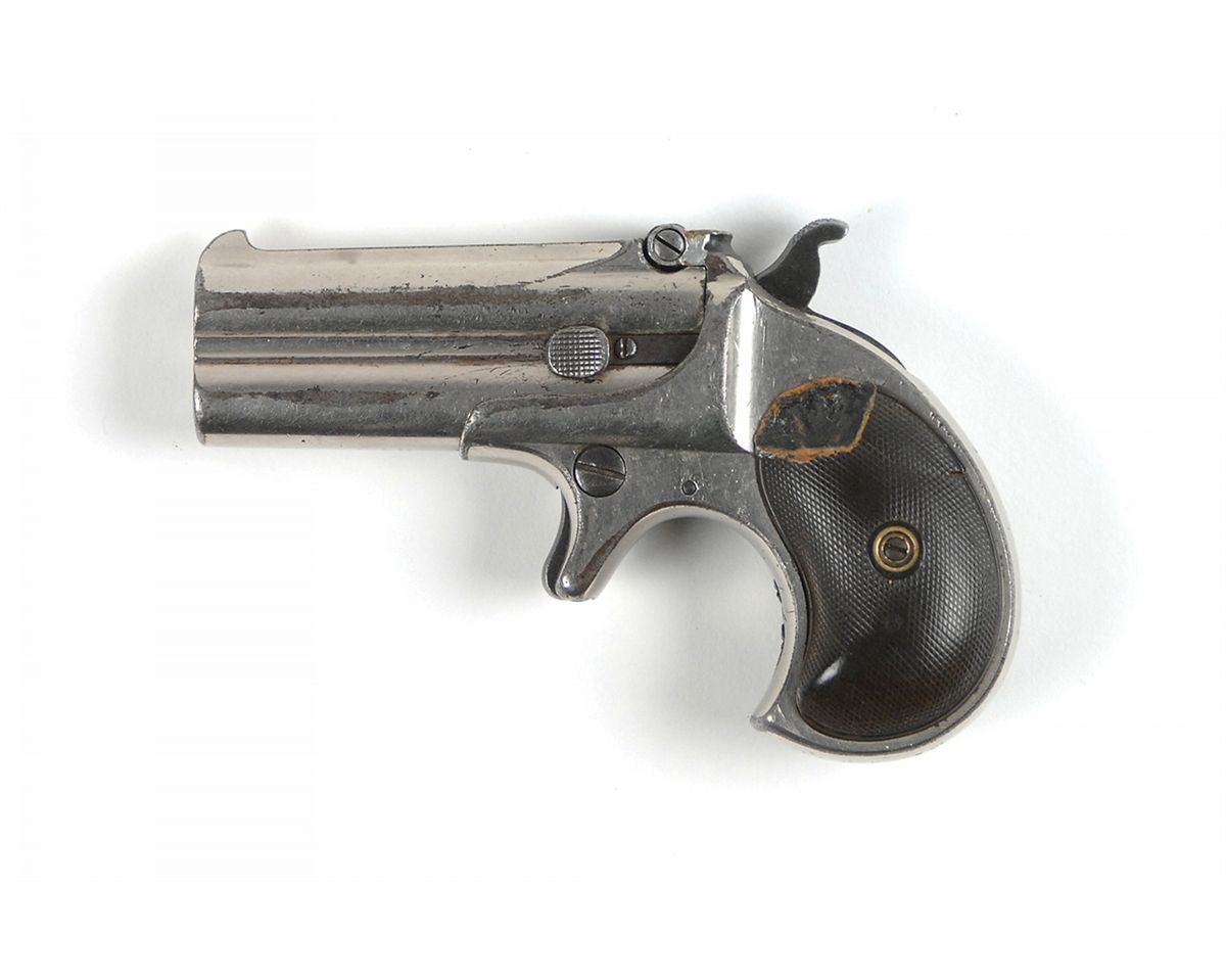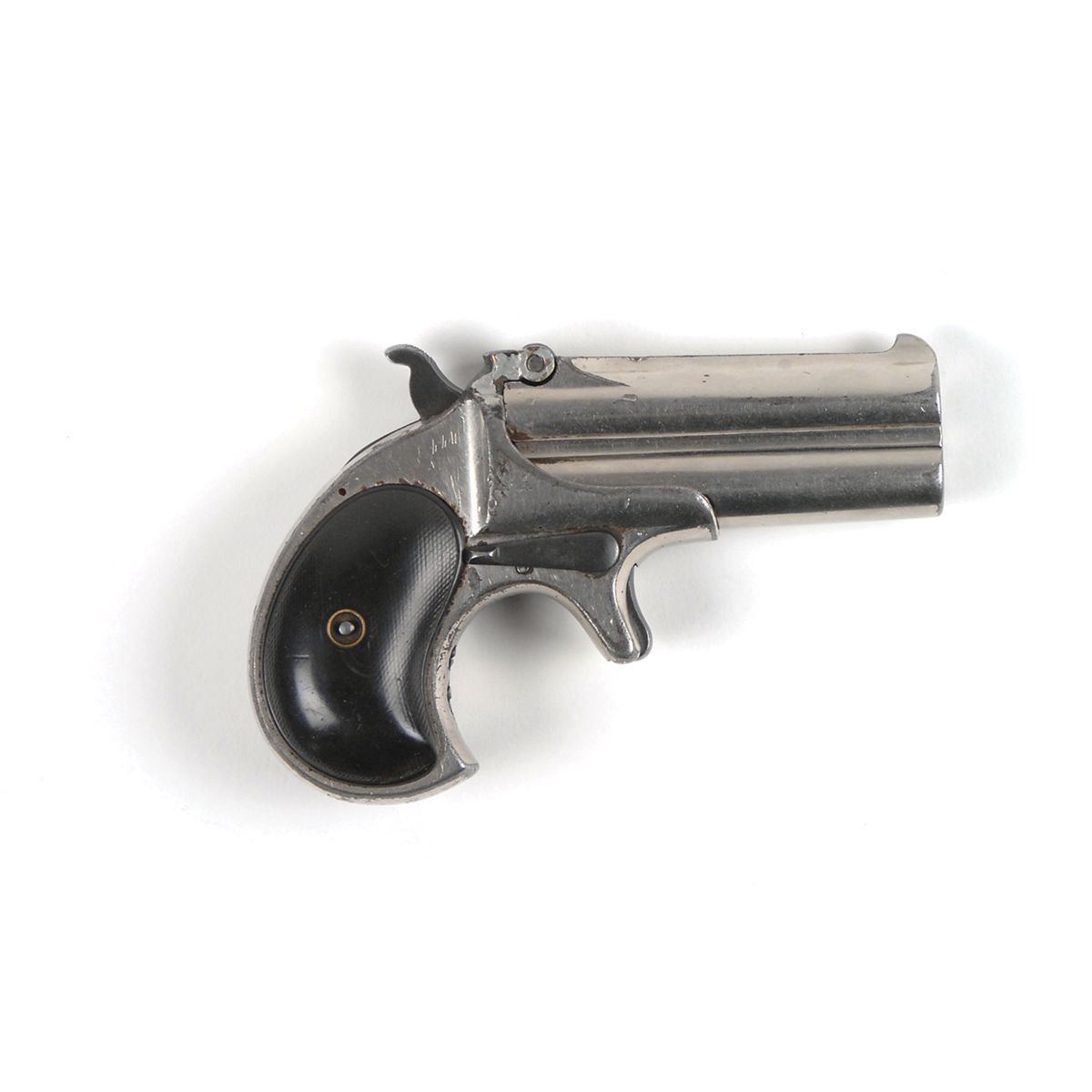 #531, cal. .41 rimfire. This is a Type II pistol with the one line barrel address “Remington Arms Co. Ilion, N. Y.” 3? barrels, the bores with worn rifling and fine to light pitting. The hinge has been repaired and the contour slightly altered. The metal retains about 85% original nickel-plating with the barrel address in fine condition. The checkered hard rubber grips show heavy wear with the top of the left grip showing a crude repair. This has matching numbers, and the mechanism works well.