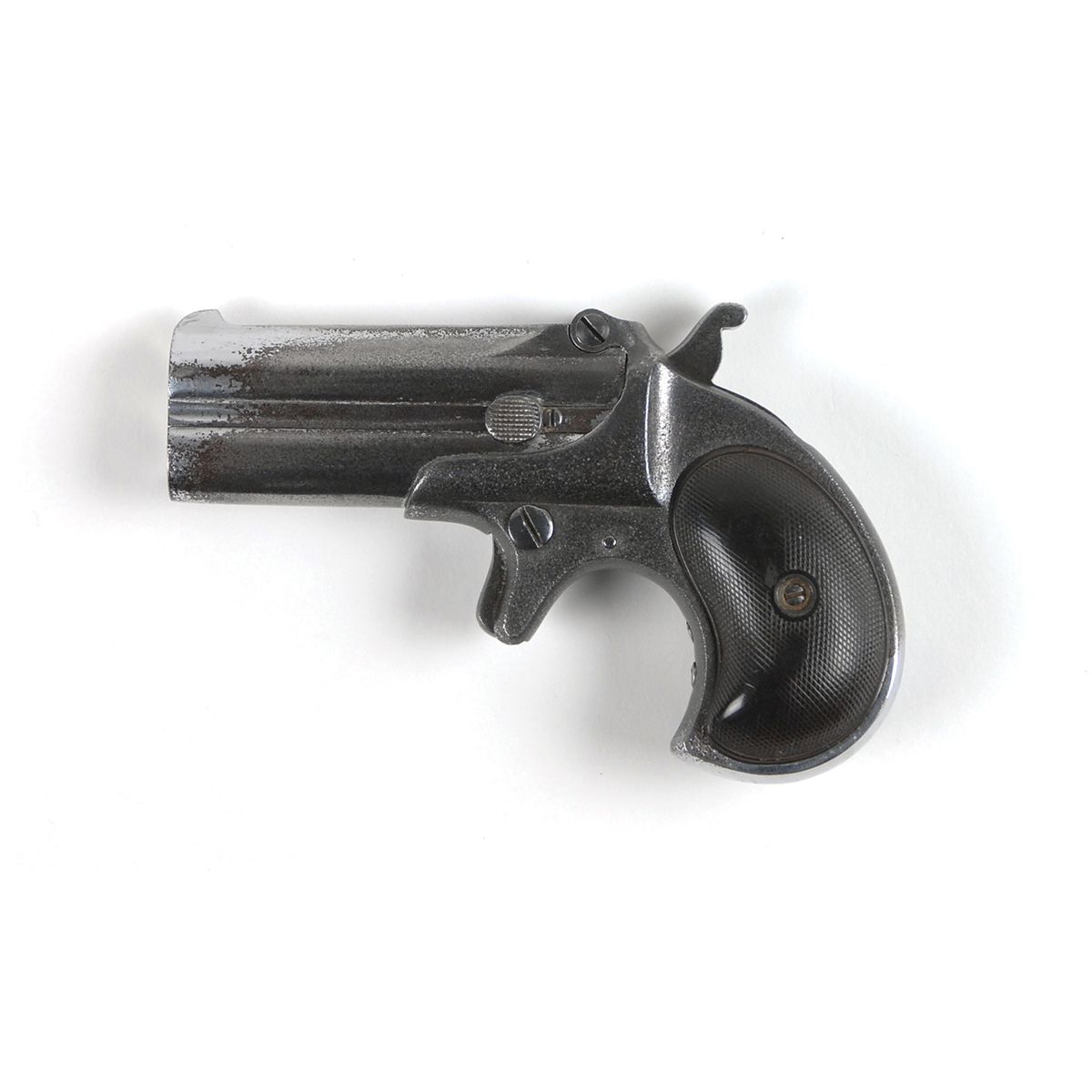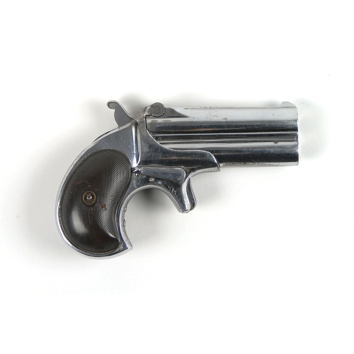 #501, cal. .41 rimfire. This is a Type II pistol with the one line barrel address “Remington Arms Co. Ilion, N. Y.” 3? barrels, the bores with worn rifling and even light pitting. The hinge has an old repair and still shows a partial hairline crack on one side. The metal retains about 50% original nickel-plating (almost all on the right side), the left side with an almost black patina and even pinprick pitting on the frame. The barrel address is in fine condition. The checkered hard rubber grips show moderate wear. This has matching numbers, and the mechanism works well.