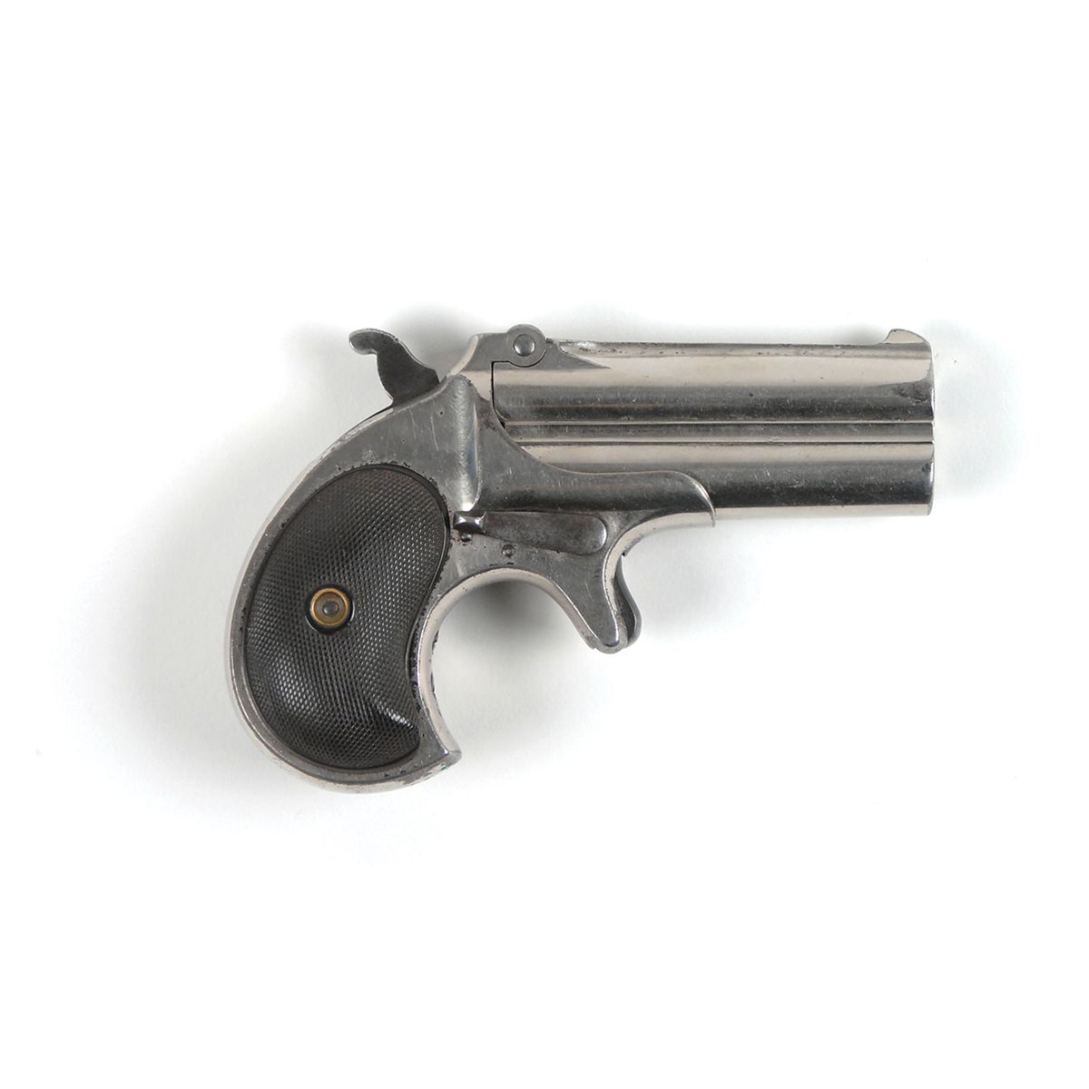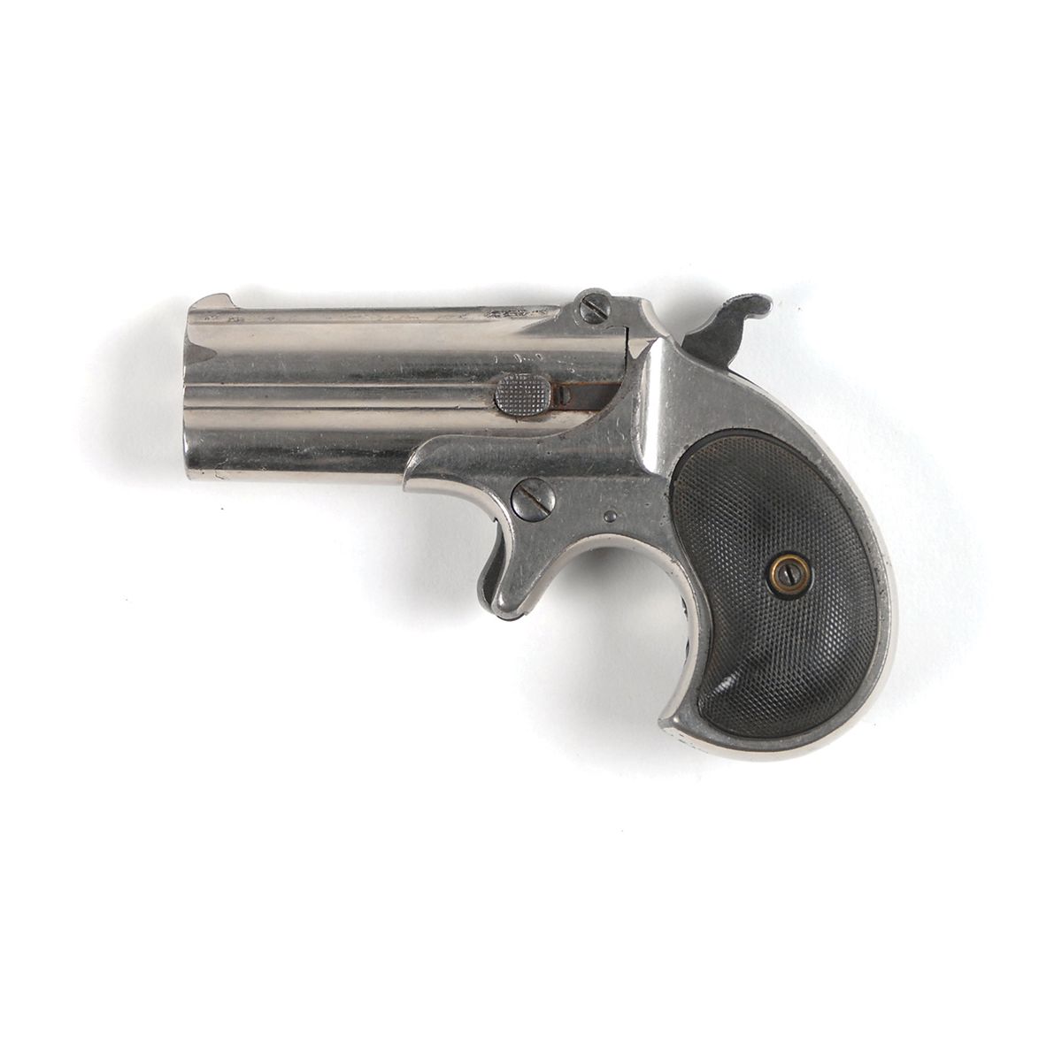 #20, cal. .41 rimfire. This is a Type II pistol with the one line barrel address “Remington Arms Co. Ilion, N. Y.” 3? barrels, dark bores with faint rifling. The hinge is good. Over 90% original nickel with excellent lettering, and fine condition checkered hard rubber grips. This has matching number, and the mechanism works well.