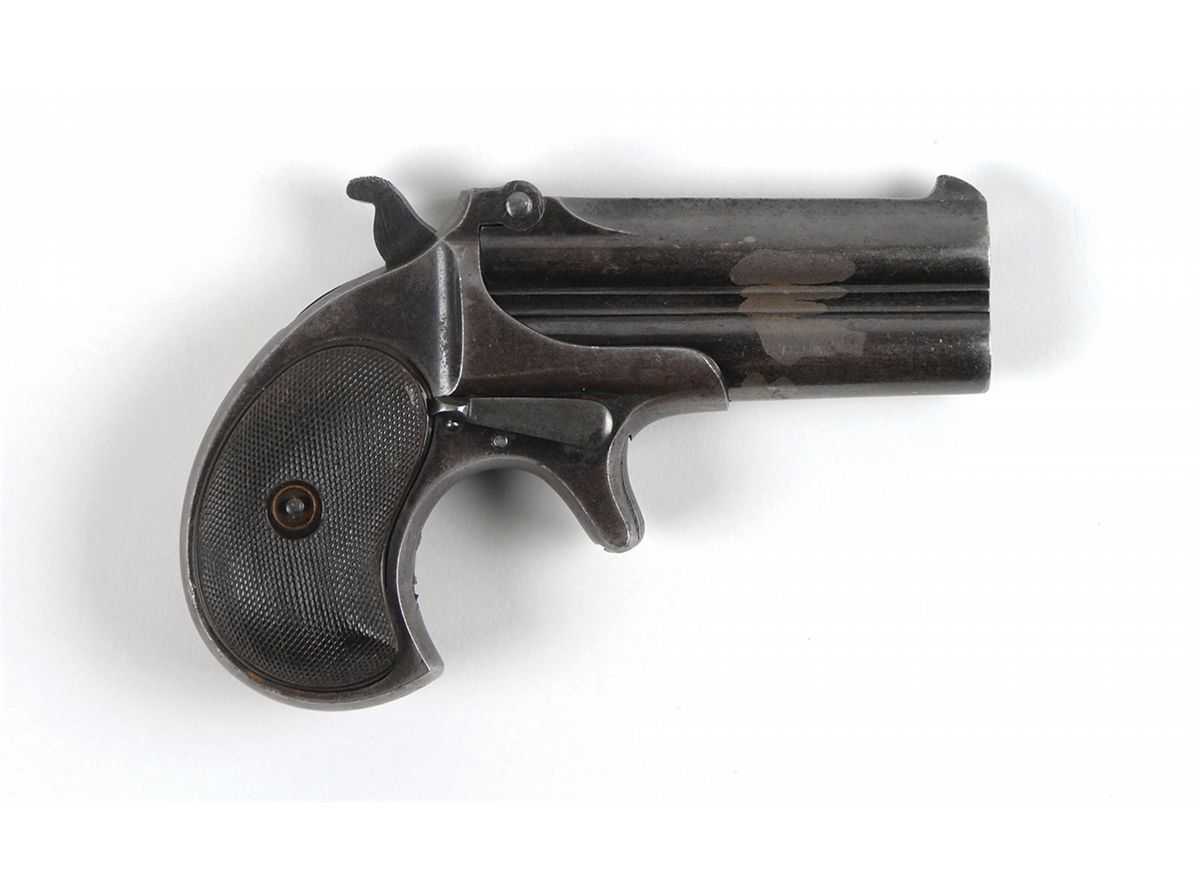 #773, cal. .41 rimfire. This is a type II pistol with the one line barrel address “Remington Arms Co. Ilion, N. Y.” 3? barrels with excellent bores. The hinge is good. About 40% of the factory blue remains with the balance a gray patina, only minor faint pitting on the left side. The barrel address is in excellent condition. The checkered hard rubber grips are in excellent condition. This has matching numbers, and the mechanism works well.