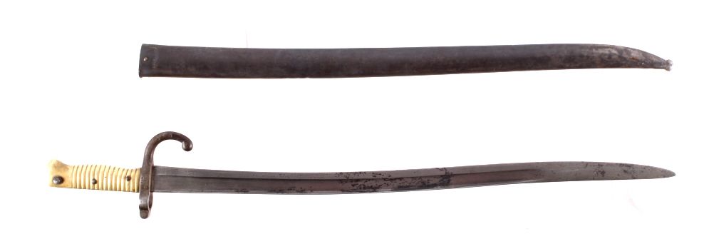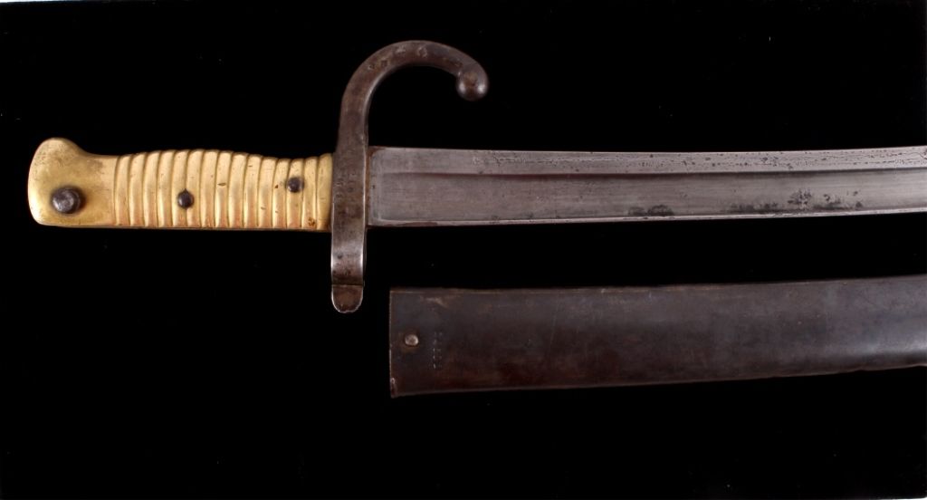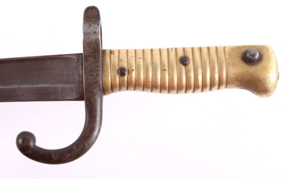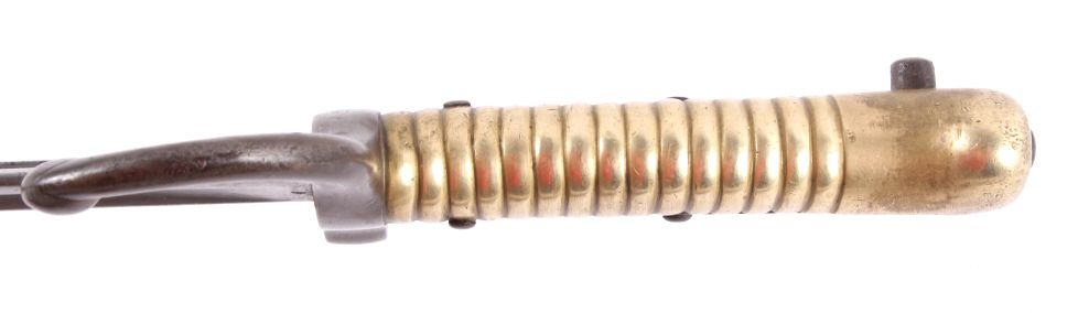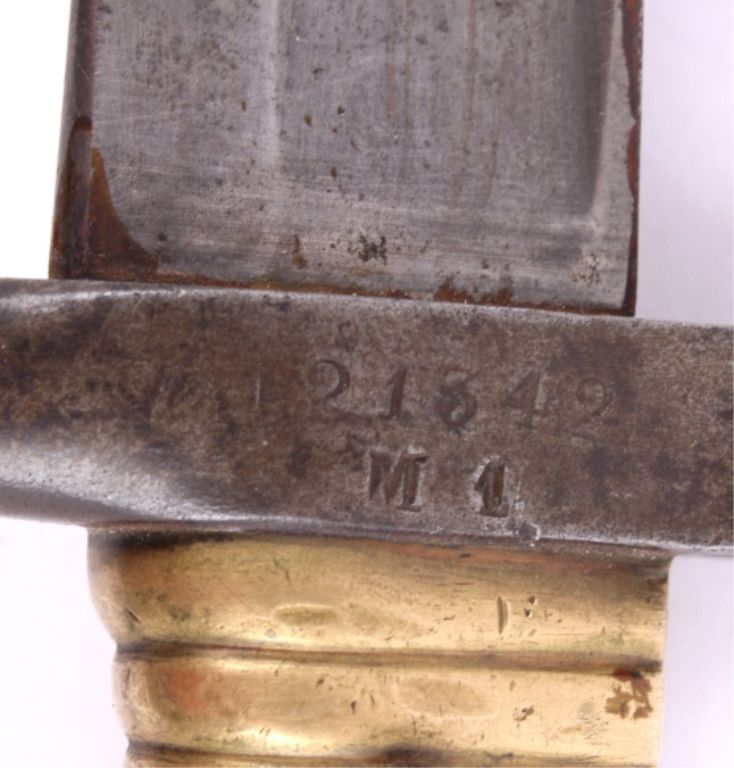 This is an original Remington No. 1 rolling block rifle Egyptian M1869 Yataghan Bayonet. This is for use with the 11 mm (.43 Egyptian) Remington No. 1 rolling block rifle and used in combat during the Franco-Prussian War of 1870–71. The bayonet features a brass handle and is marked, "21342 M1 ('B' in a diamond proof marks) ('M' in a circle)." The piece is in overall good condition and comes with the original metal scabbard. This is a rare very early piece. Bayonet measures overall without scabbard 27.5" long with a 22.5" blade.