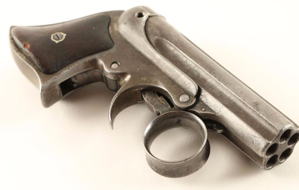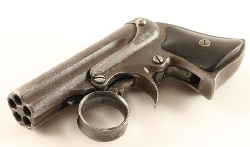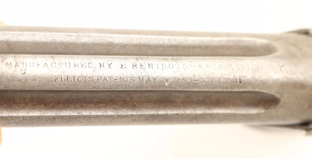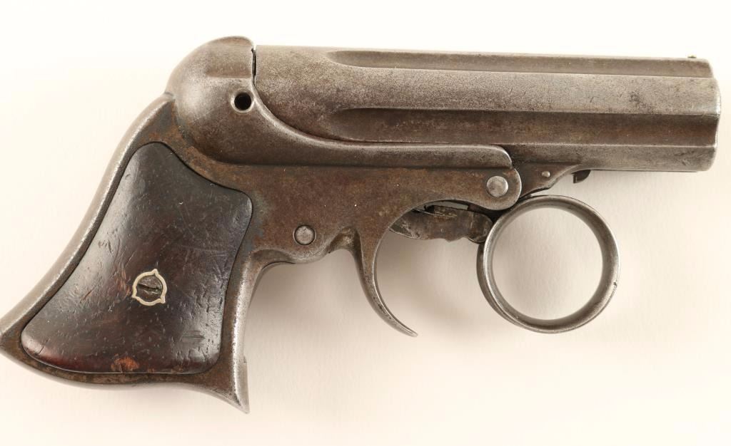 Early, five barreled pepperbox pistol chambered in .22 caliber with revolving firing pin, circa 1863-1888. Features a nickel finish, 3" barrels with two line address, bead front sight, ring trigger, and two piece smooth wood grips. Serial numbers match on barrel and frame. The finish has mostly worn with only traces evident in protected areas. Action function well, markings are faint, bores are good and wood grips show a small loss on the right panel. Condition is good++. ***Antique Firearm***
