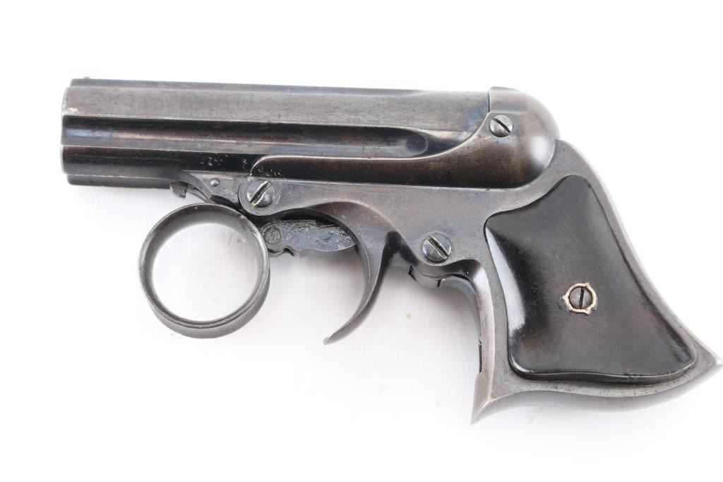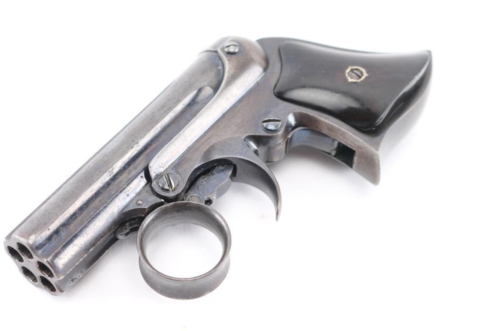 Rare Remington-Elliot "Pepperbox" Derringer, made 1863-1870's with estimated 30% in .22 caliber, blue finish brings premium, (Flayderman) Five shot stationary fluted 3" barrel with revolving firing pin, ring type trigger. Barrel tilts forward for loading. Smooth rosewood grips, matched serial numbers on the underside of barrel, & inside of frame, barrel lug marked "M". Barrel marked "Manufactured by Remington Sons, Ilion, NY Elliot's Patent May 29,1860, Oct 1, 1861.An improved version of the "Zig-Zag" derringer. Very fine condition as a antique firearm, rifled bores are very good/bright, need cleaning, about 40% of the blue finish remaining with handling loss, grips are good overall, except the left panel has a crack, mechanically excellent. Comes in nice felt lined glass topped display case with brass plate with info on this gun, including a box of German made 6mm Flobert/ 22 BB Cap bullets (Bulleted Breech Cap) which also fit this gun. Scarce in this condition. NRA Condition-Fine. Antique Firearm.