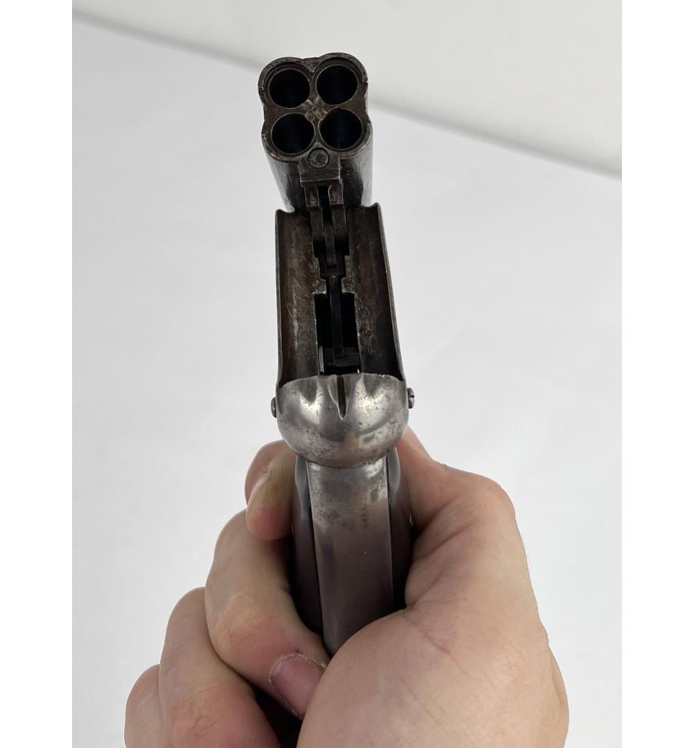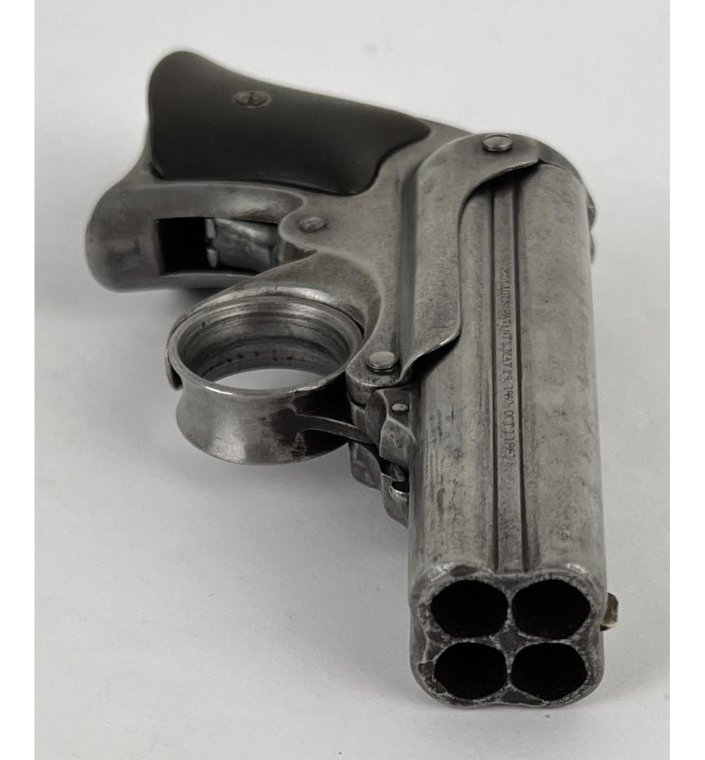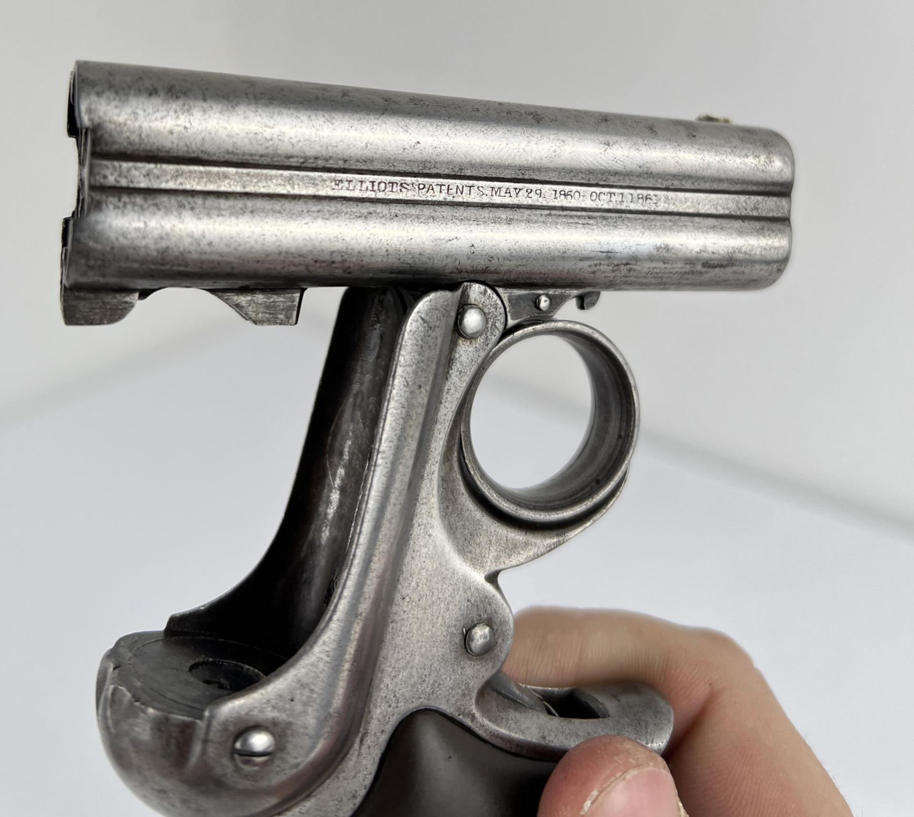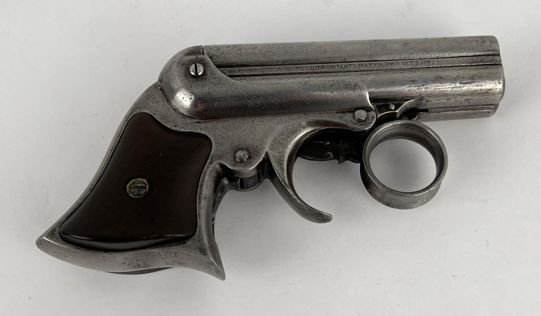 #5966 stamped on barrel and frame. "Elliot’s Patents May 29, 1860, Oct. 1, 1861 stamped right side on barrel flat. Hard rubber grips, ring type trigger, four barrels with rotating firing pin, unique cocking mechanism. Barrel group tilts forward for loading and unloading. Manufactured between 1863 –1888. Firing pin rotates correctly. Action in working. Does Not require FFL Transfer.