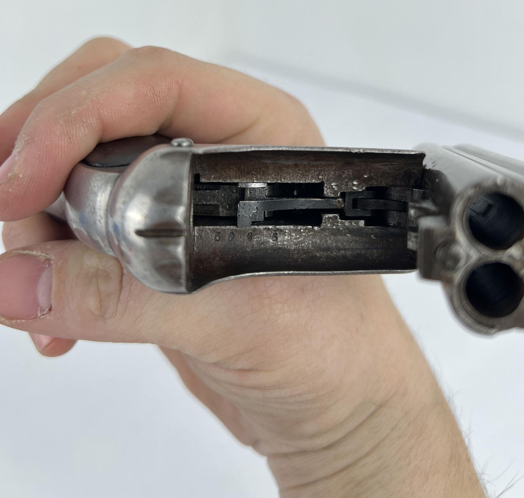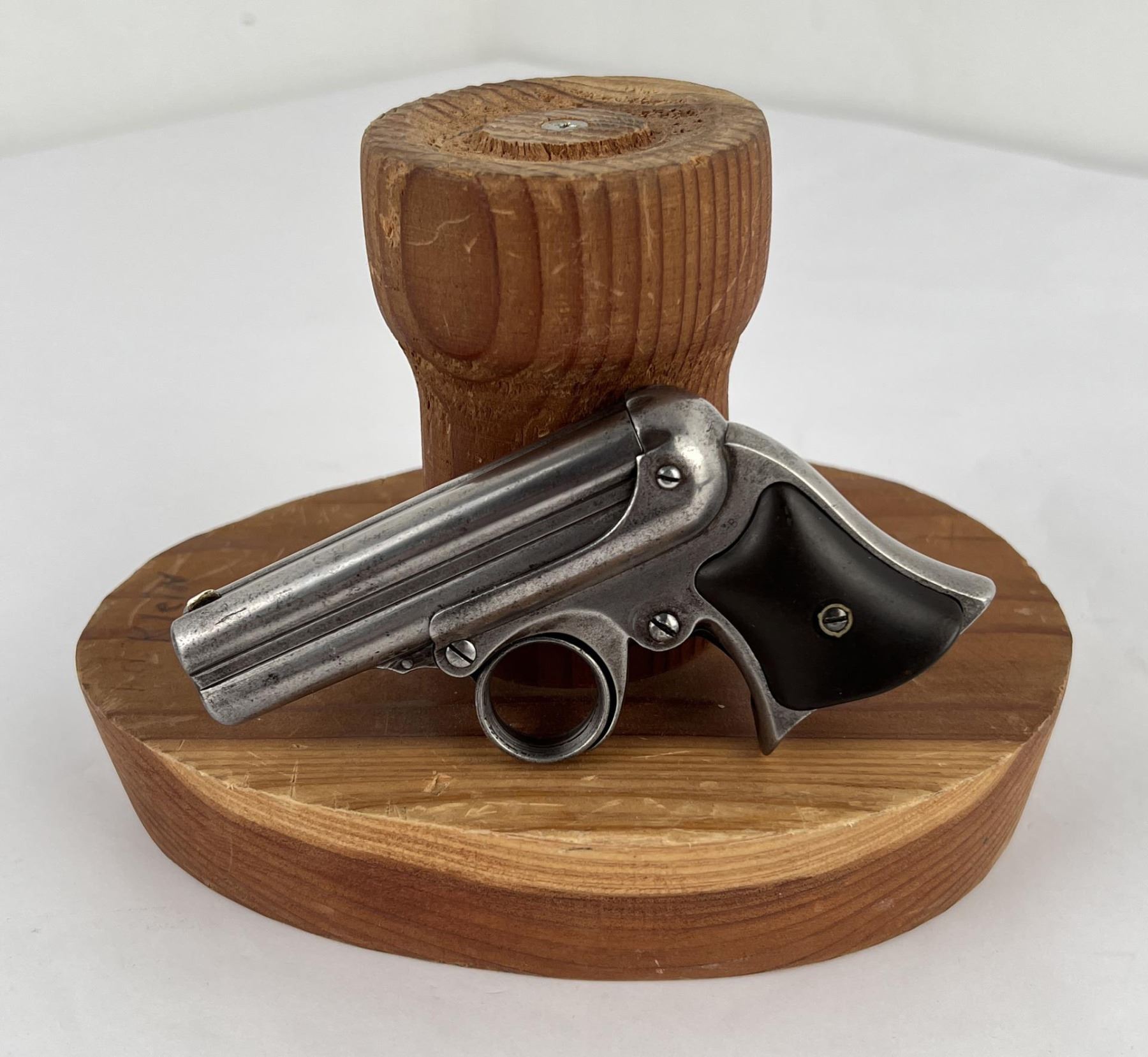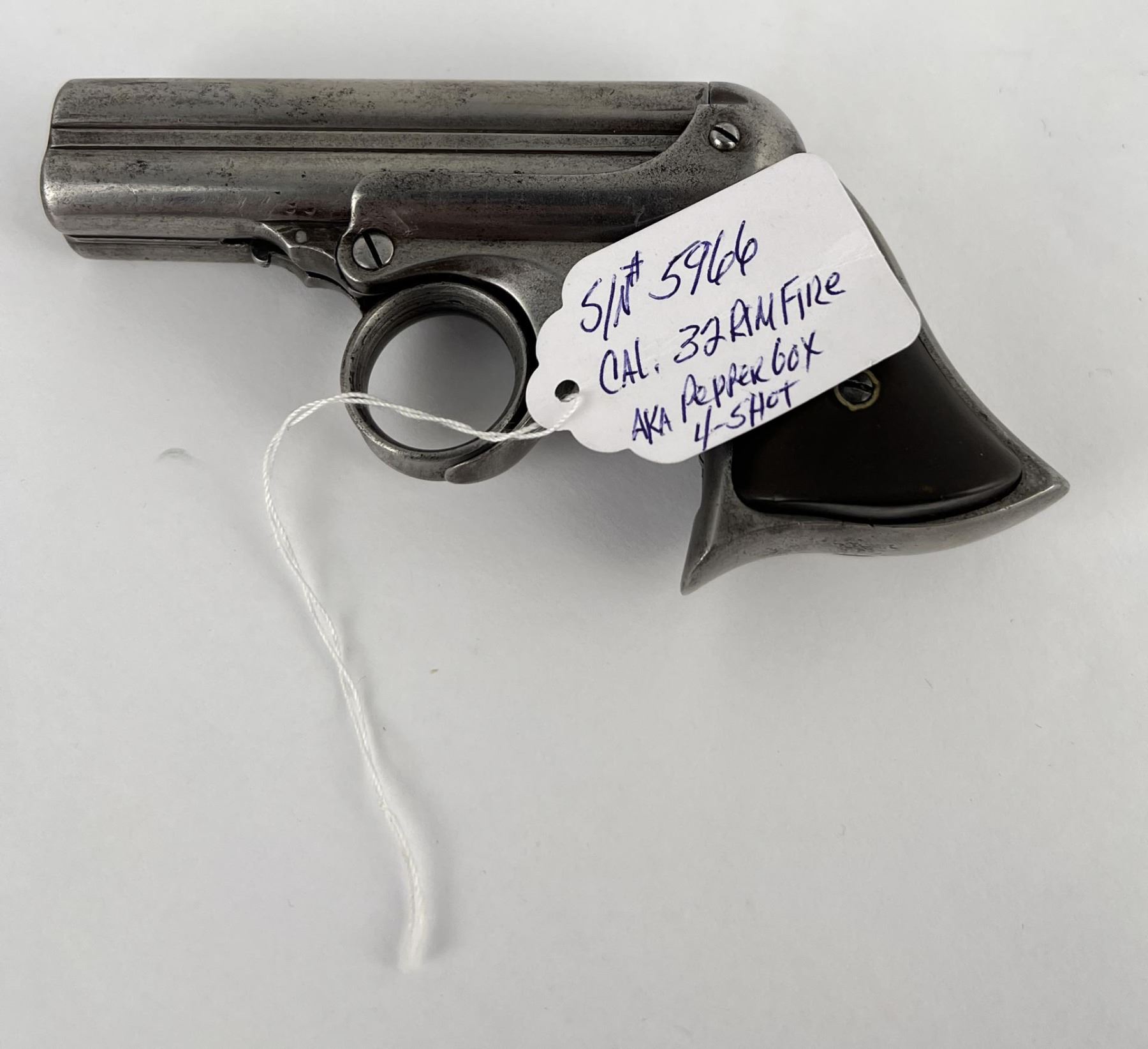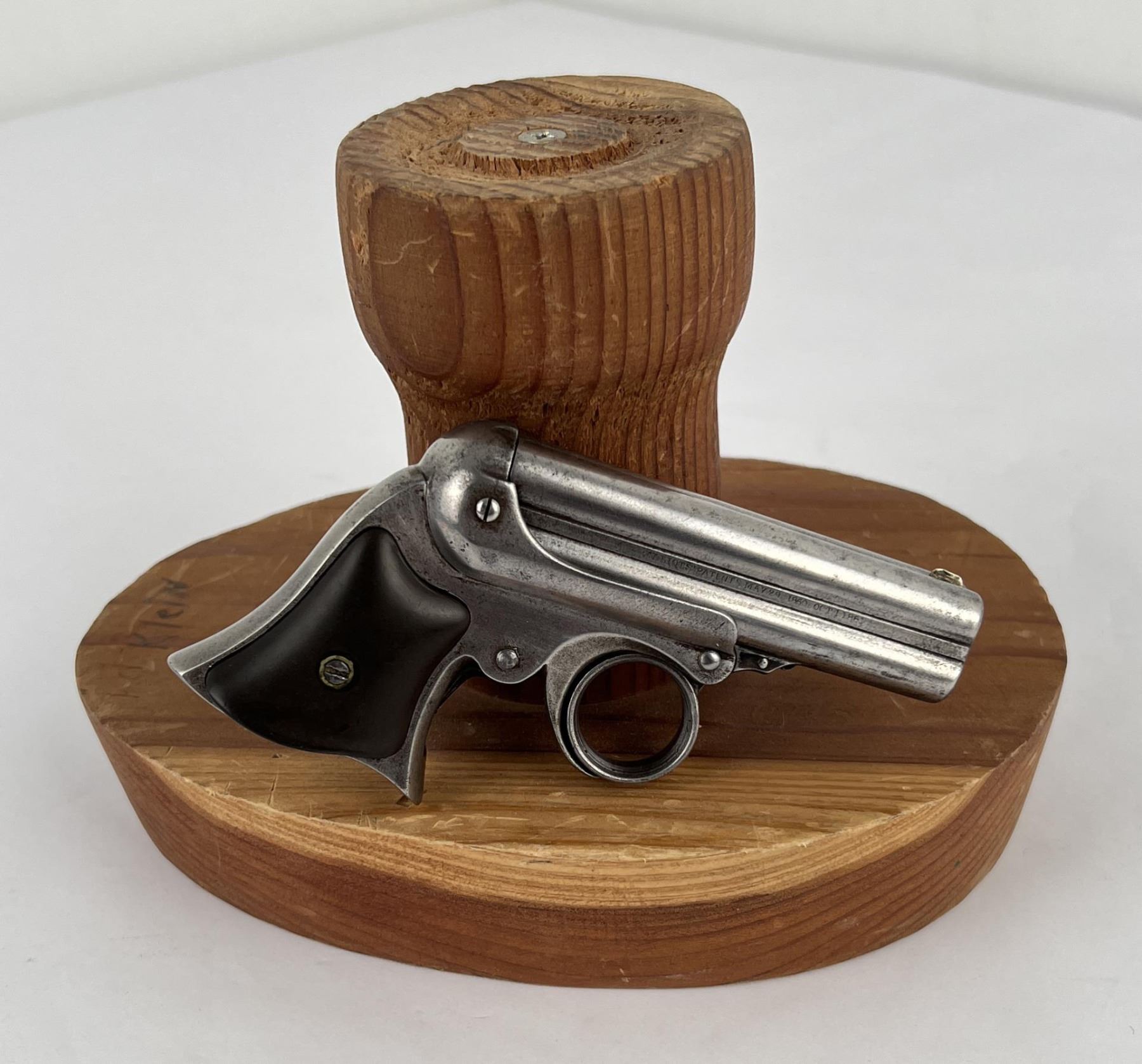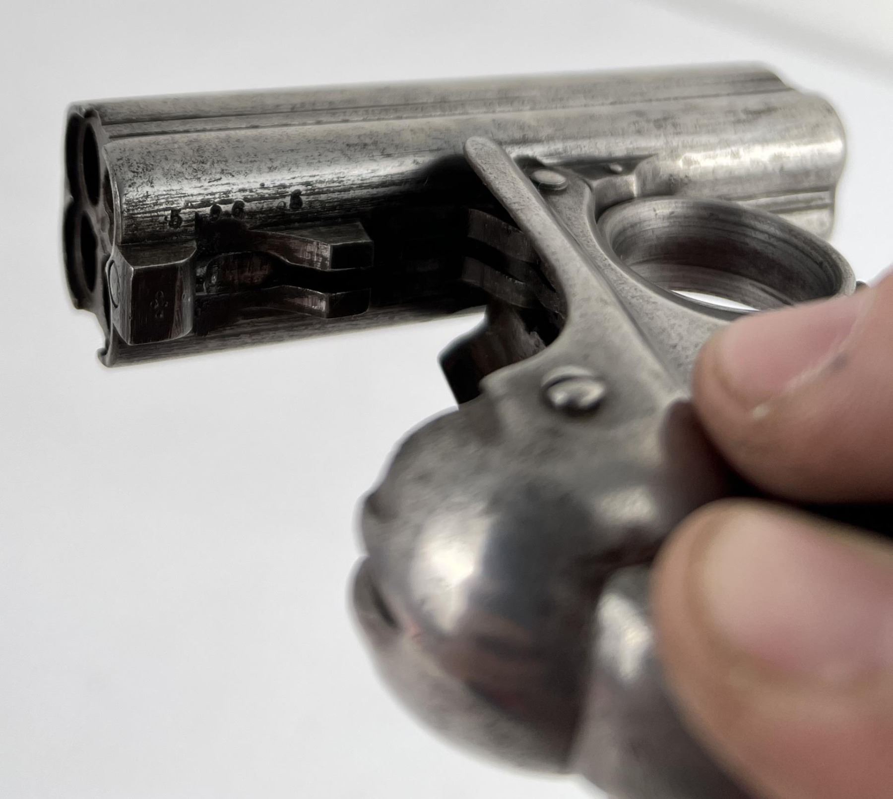 #5966 stamped on barrel and frame. "Elliot’s Patents May 29, 1860, Oct. 1, 1861 stamped right side on barrel flat. Hard rubber grips, ring type trigger, four barrels with rotating firing pin, unique cocking mechanism. Barrel group tilts forward for loading and unloading. Manufactured between 1863 –1888. Firing pin rotates correctly. Action in working. Does Not require FFL Transfer.