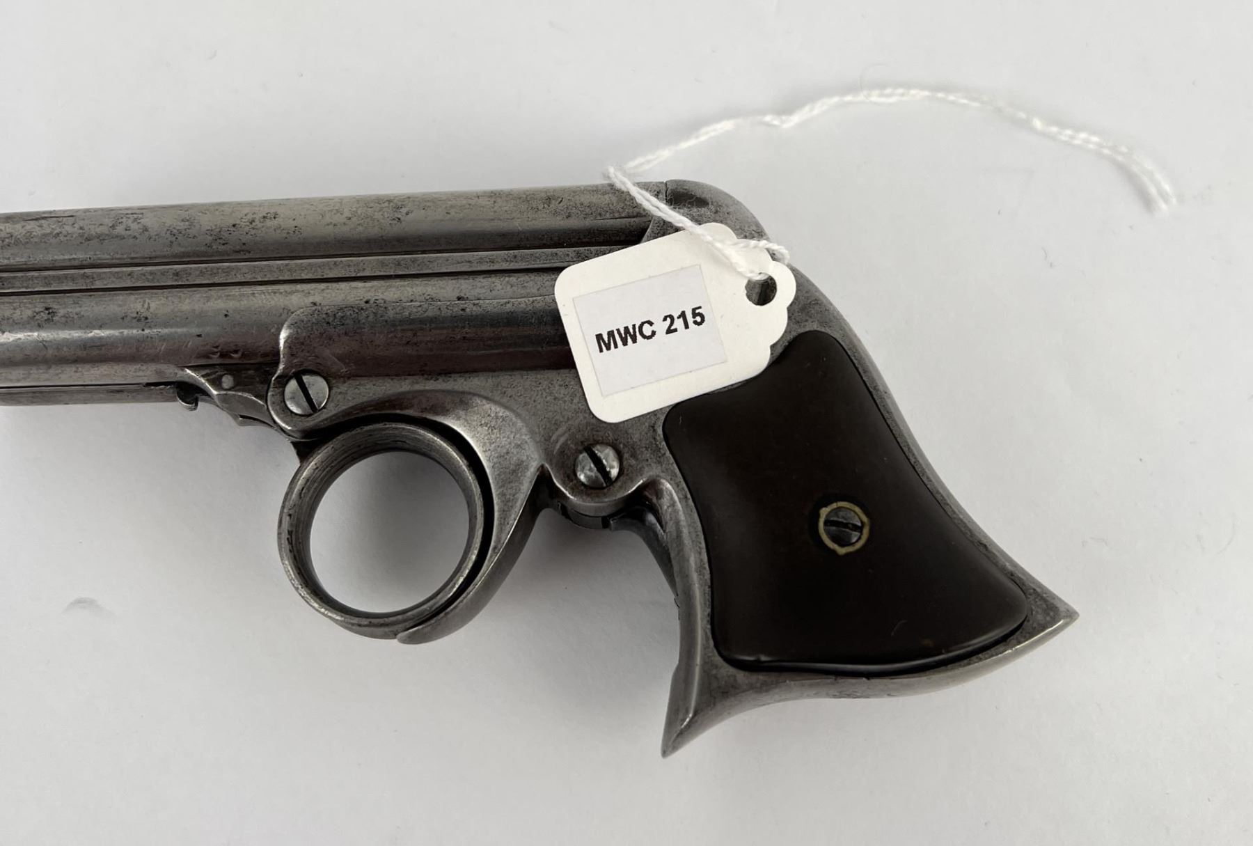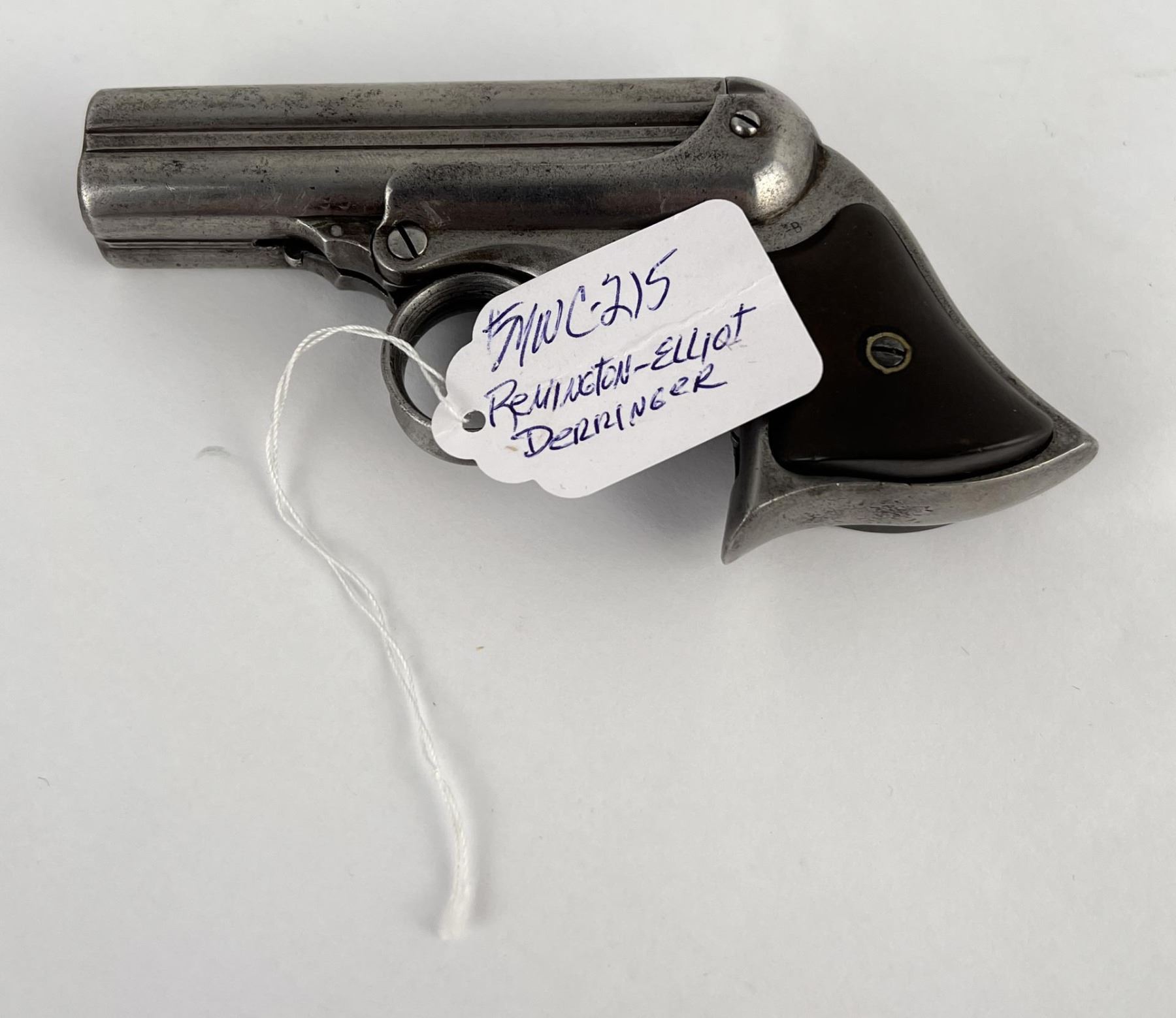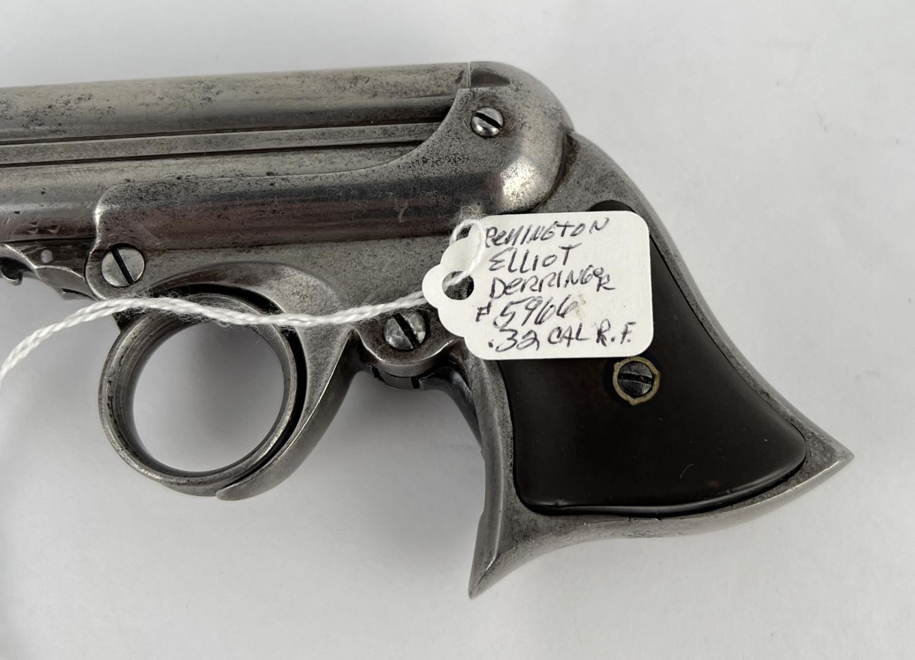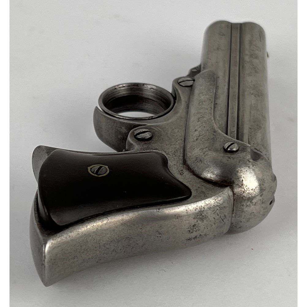 #5966 stamped on barrel and frame. "Elliot’s Patents May 29, 1860, Oct. 1, 1861 stamped right side on barrel flat. Hard rubber grips, ring type trigger, four barrels with rotating firing pin, unique cocking mechanism. Barrel group tilts forward for loading and unloading. Manufactured between 1863 –1888. Firing pin rotates correctly. Action in working. Does Not require FFL Transfer.