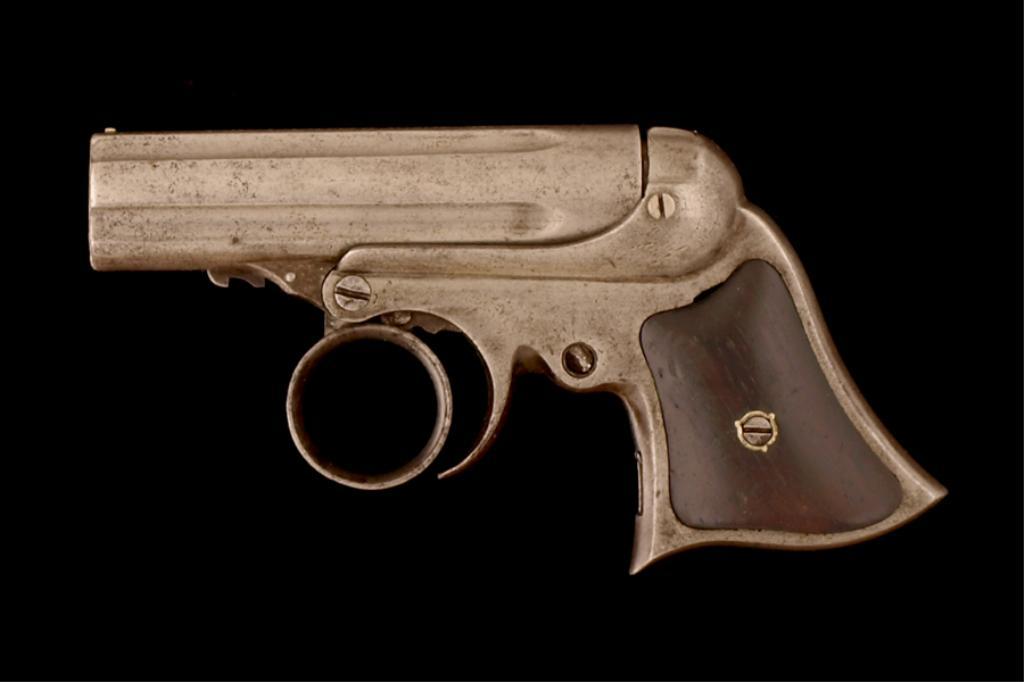 Remington-Elliot Pepperbox Cal .22 SN:4763 Cartridge, 5 shot, pepperbox pistol with ring trigger. Blued finish, smooth wood grips panels, 3" barrels. Condition: Finish worn/removed to gun metal grey. Grips show some use but finish is still intact.