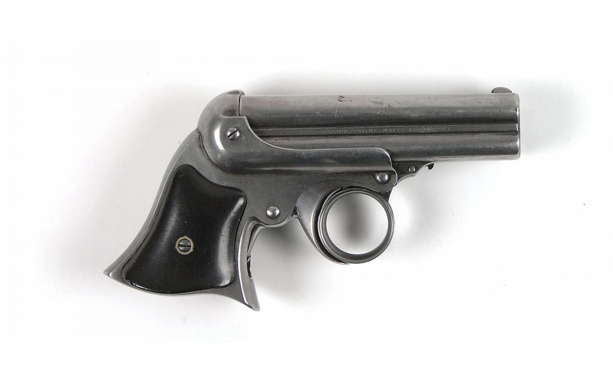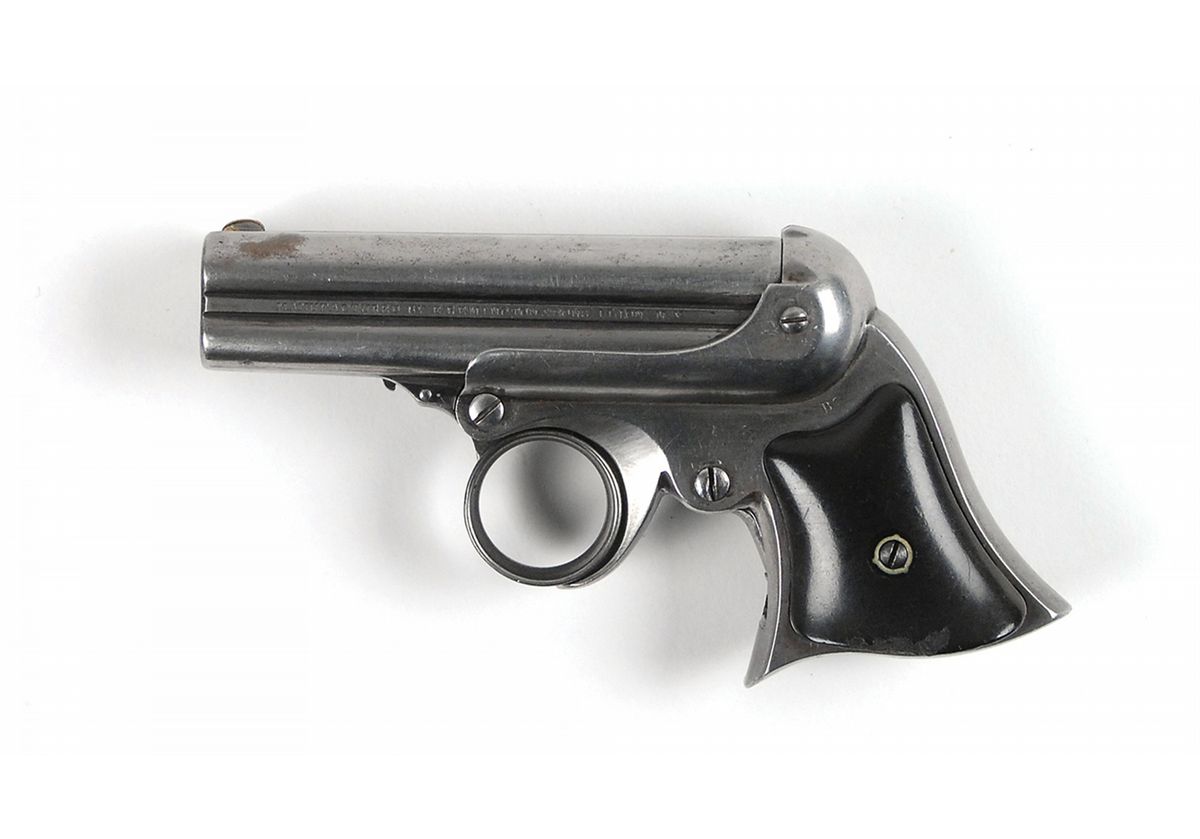 #8065, cal. .32 rimfire. The 3 3/8? four-shot barrel cluster with strong rifling has bores that should clean to very good or better. The metal retains traces of blue on protected areas with the balance a clean steel gray with no pitting. All of the factory markings are in excellent condition. The brown hard rubber grips have a few small chips missing on the bottom of the left grip, otherwise they are in fine condition. This is a double-action pistol with a ring trigger; the cocking mechanism doesn’t function.