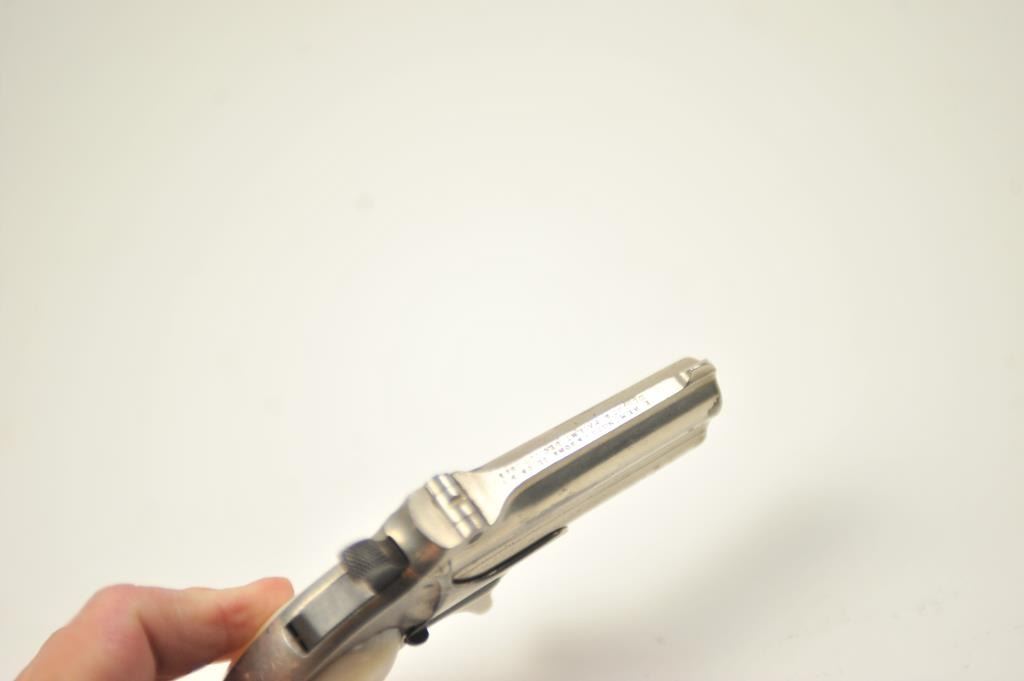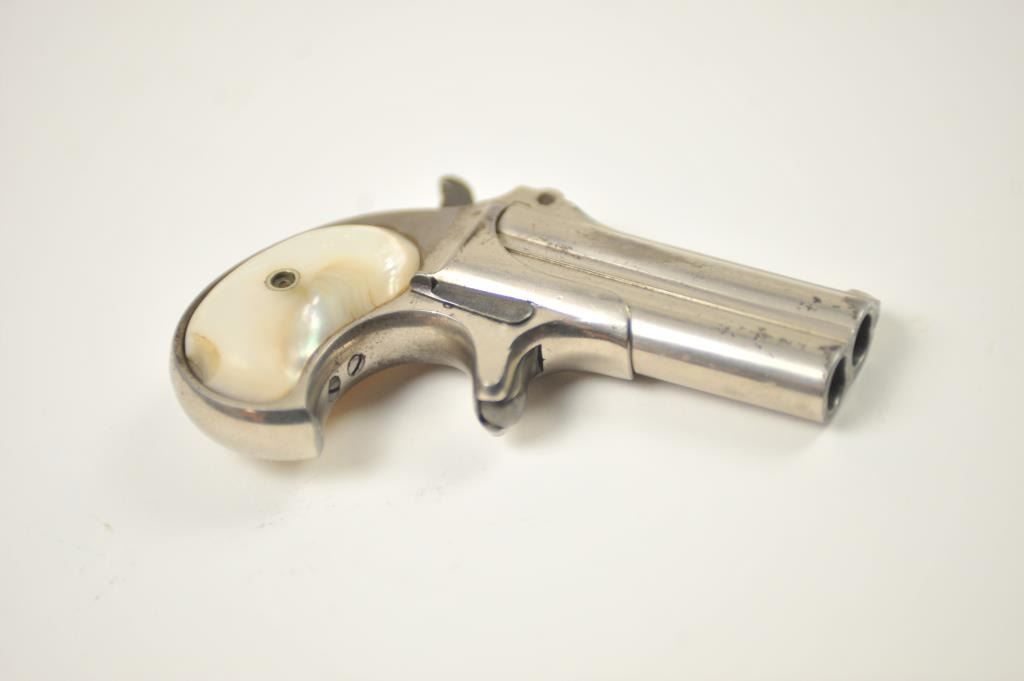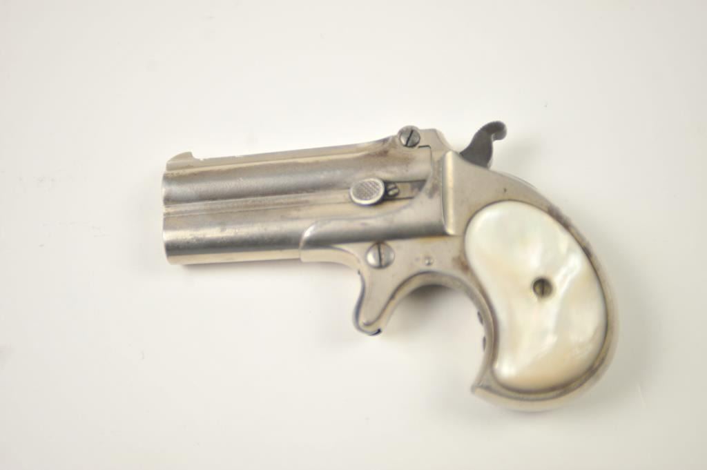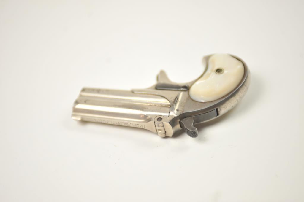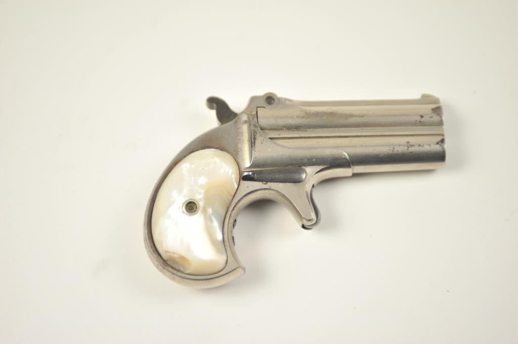 Remington Elliot’s Patent O/U Derringer in .41 rimfire with two-line address “E. Remington & Sons New York Elliot’s Patent Dec 12 1865”. Nickel finish and original pearl grips. 60%-80% toned nickel with drifting tonatural metal. Sharp markings and edges. Bright blue on small parts. Very good period grips. Sound hinges with no cracks. Good action and interior. 1 large chip to bottom right grip. The old west gambling favorite.(Antique) Est.: $500-$1000