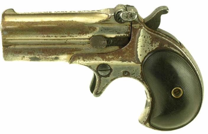 Derringer nickel finish & hard rubber grips. Poor to fair condition with good action, welded & repaired upper hinges, dark pitted bores. FFL Required.