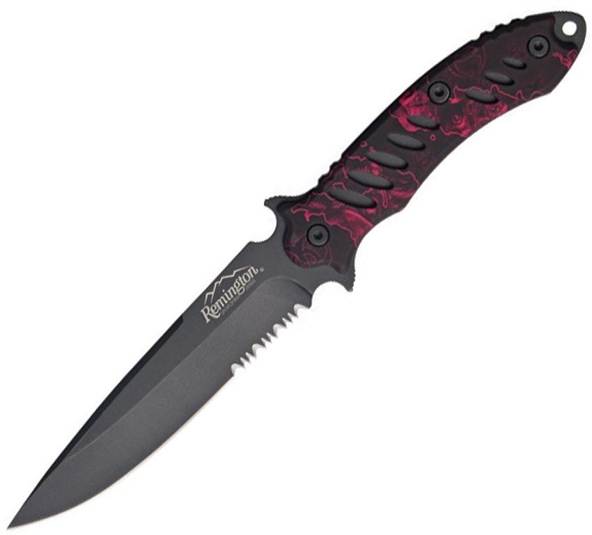 F.A.S.T. Fixed Blade Red - 10 1/4" overall. 5 1/2" black finish 440 stainless partially serrated clip blade. Full tang. Black anodized aluminum handles with rubber coated red Flesh Reaper Z pattern. Lanyard hole. Black nylon belt sheath.