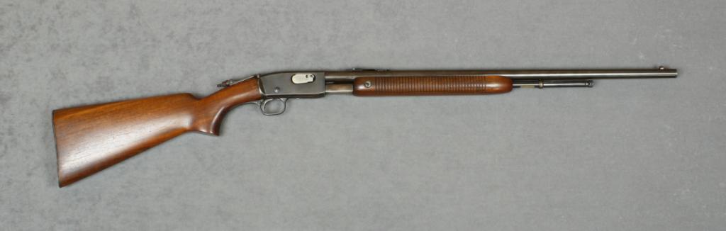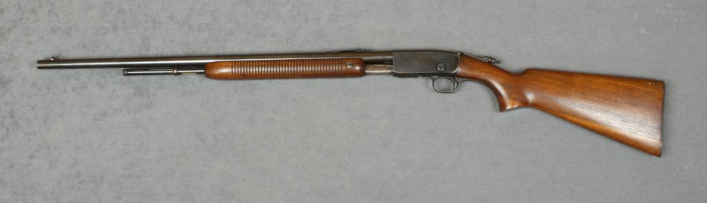Remington Fieldmaster Model 121 pump action rifle, .22 short, long or long rifle cal., 24” round barrel, blue finish, wood stocks, #12343. This rifle is in overall fine condition showing approx. 75% original mutedblue finish, very good to fine bore, markings, action and stocks with correct checkered Remington metal butt plate and flip up adjustable tang sight. Est.: $150-$300.