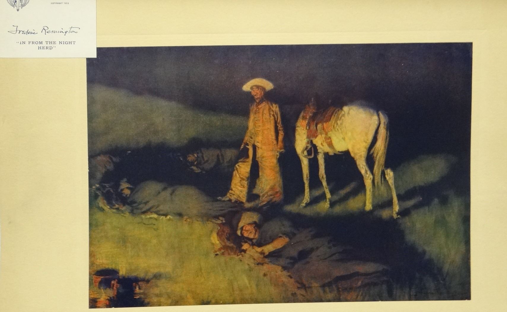 Remington, Frederic, 4 colored lithos/aged folio, Artist's Proof, all 12.5" x 8.5", Bringing Home the New Cook, In From The Night Herd, Benighted for a Dry Camp, The Quarrel