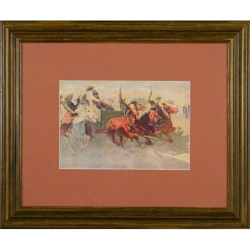 This is an artist proof of Frederik Remington?s (1861-1909) Bringing Home the New Cook. This proof is a beautiful picture of the old west with men riding horses, waving their guns in the air, and the long evening shadows casting their gray and purple hues over the warm, sand colored ground. The horses are beautiful shades of red and brown with one of the horses being white contrasting the rest. It is matted in terracotta colored mat and a stained wood frame that goes terrifically with the picture. This proof measures 8.5? x 12? alone, but the frame brings it to a total size of 20?x 24?. The proof mark is located in the bottom right hand corner.