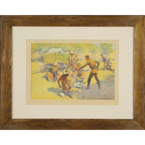 <table width="100%" border="0" cellspacing="0" cellpadding="4"><tr><td><em> </em></td></tr><tr> <td width="100%"> This is a print of Frederick Remington?s The Quarrel is in very good condition and is very attractive. It is full of vibrant blues and greens tempered with brilliant yellows and oranges. The tension between a few men is mounting and the story unfolding in this painting draws the viewer in. Frederick Remington was a big name in illustration in the late 1800?s. He was best known for images like this print of the west. This print is an artist proof and measures 8.5? x 12.5?. It is matted in a white mat that allows the vibrant colors to be of the most high appeal, and a dark stained wood frame that makes the entire piece 17.75? x 21.75? total. </td></tr><tr> <td> </td></tr><tr> <td>Reference #: 9090</td></tr><tr><td>Condition:very good</td></tr><tr><td>Year:0000</td></tr><tr><td>Height:17.75</td></tr><tr><td>Width:21.75</td></tr><tr><td>Title:Remington Frederik - The quarrel - Print</td></tr><tr><td>Location:Grosse Pointe Park, MI. 48230, USA</td></tr></table>