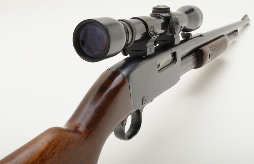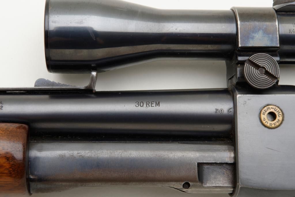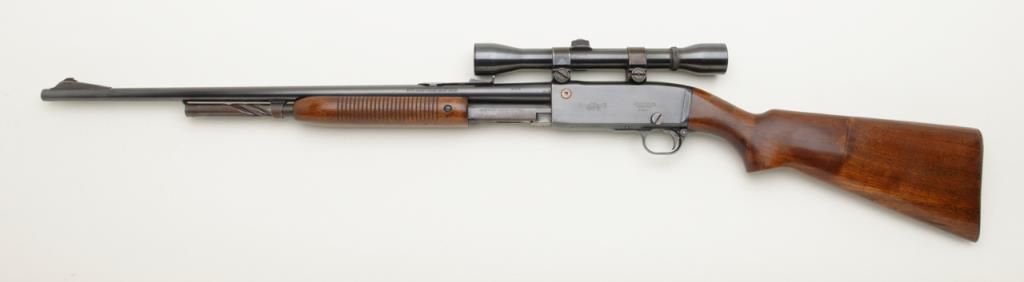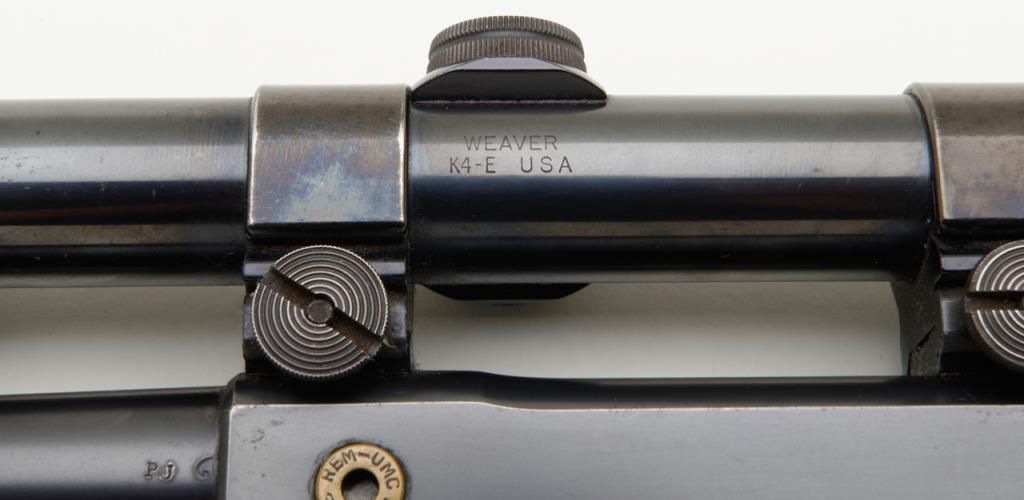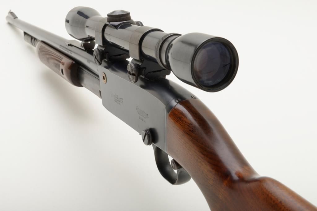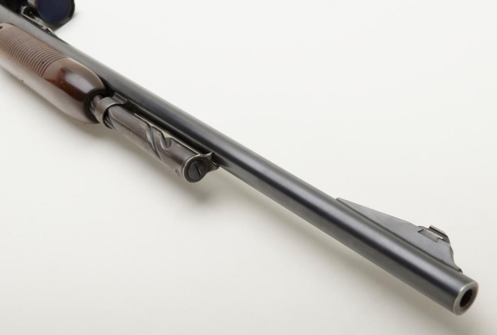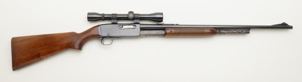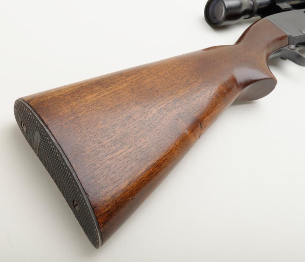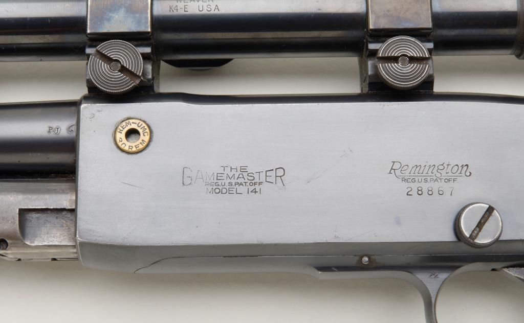 Remington Gamemaster Model 141 pump action rifle in .30 Remington caliber with takedown frame in early production series, serial number 28867. The rifle is mounted with a Weaver K4-E scope on Weaver mounts. The rifle shows 90% to 95% original blue with some original case colors on the trigger and small parts. The stocks are very good plus to near fine with just a couple small marks and minor handling. The markings are sharp and the action is crisp and the bore is bright. A classic early pump rifle in exceptional condition. Est.: $350-$700