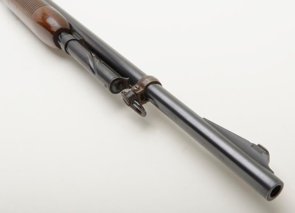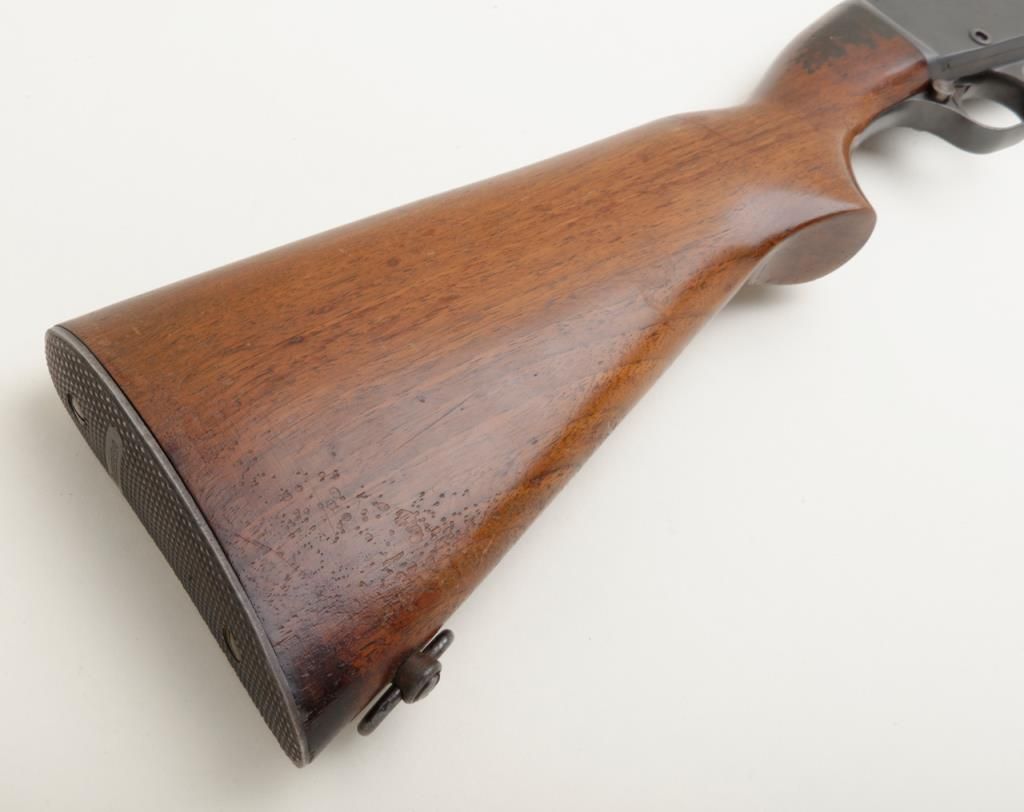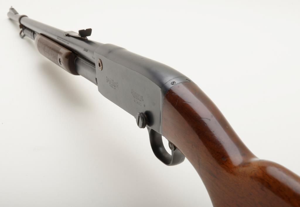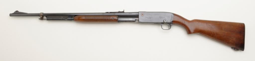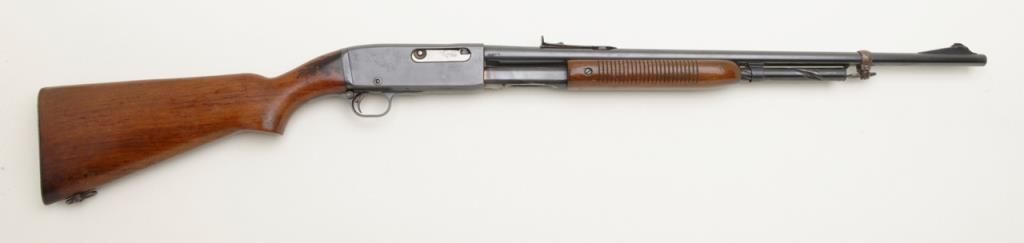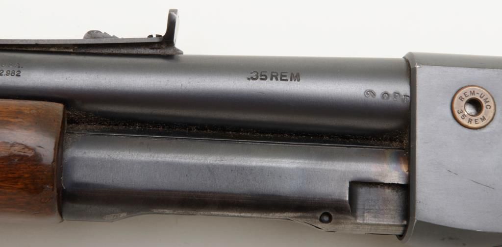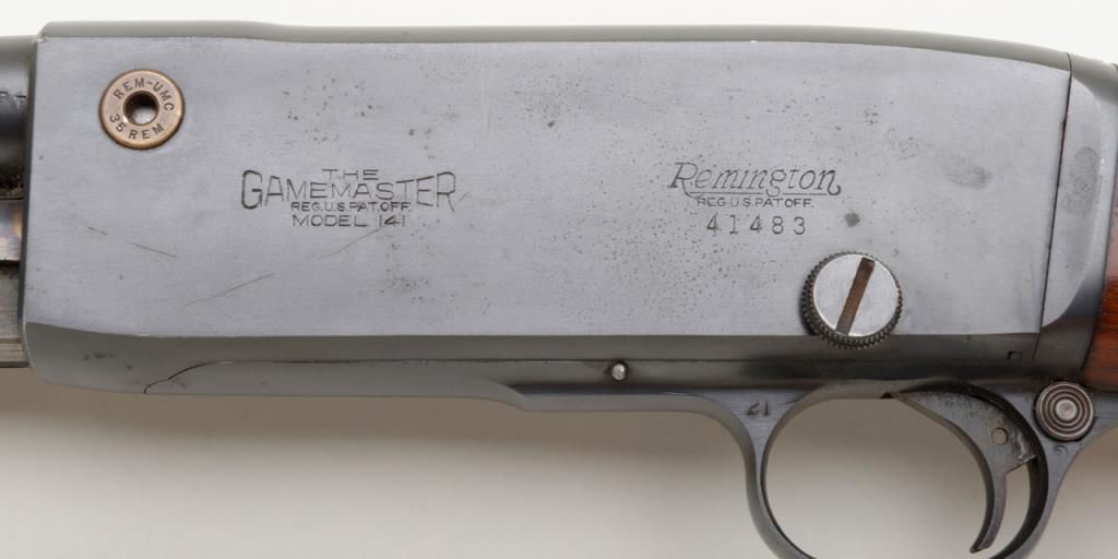 Remington Gamemaster Model 141 pump action takedown rifle in .35 Remington caliber remaining in very good plus original condition, serial number 41483. The rifle shows 90% to 95% original blue, some minor erosion and natural aging just starting. There is some original colors on the magazine tube. The markings are sharp and the edges are crisp. There has been a sling swivel which is removable added to the barrel and a non-factory sling swivel screwed into the butt stock. The stocks are very good with some slight scratches, staining, normal wear and aging. Also there is a dark area on the right side of the stock where it meets the frame which is stained and possibly an area of minor repairs. The action is tight and the bore is bright. Est.: $400-$800