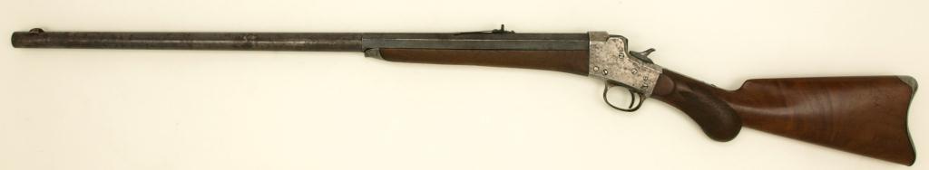 single shot rifle, 30" heavy half round, half octagon barrel, blue and case harden finish, good walnut stocks, pistol grip and checkered rear. Barrel retains blue drifting to brown patina, areas of scattered erosion, silver blade front site, sporting open site rear, top of barrel marked "E. Remington & Sons Ilion, NY", bottom in front of forend stamped "40 1 7/8", receiver shows muted case color turning to gray, scattered areas of pin pricked pitting , heavy right side, right side stamped "Heburns Pat. Oct. 7,1879". Good metal wood fit up, stocks checkering somewhat flattened out, no cracks or repairs. Very good action, good bore. NO FFL required.