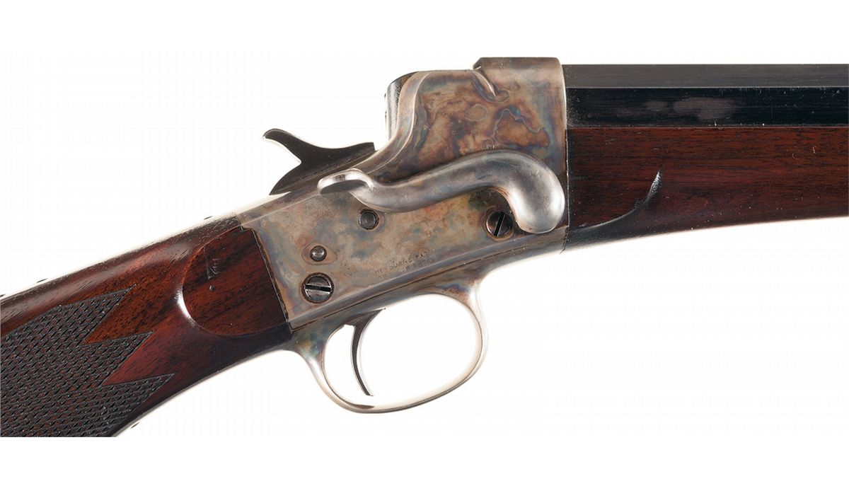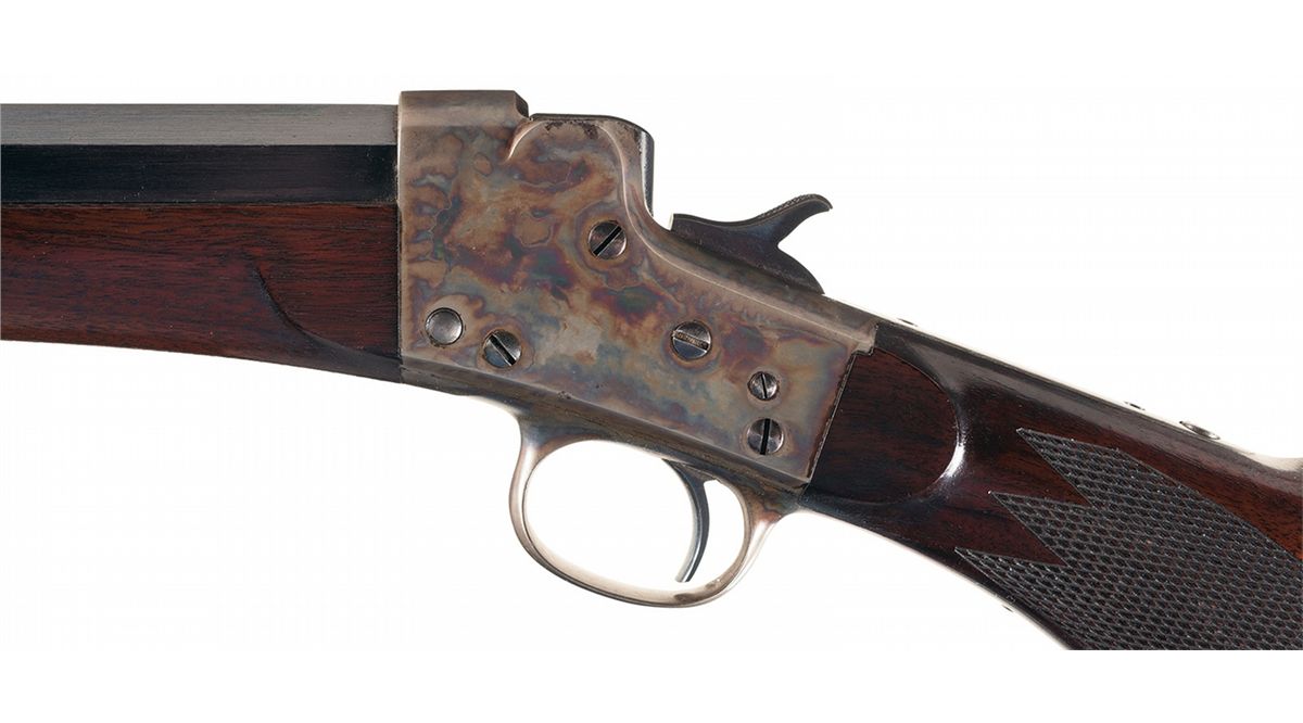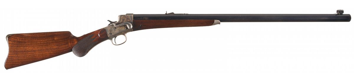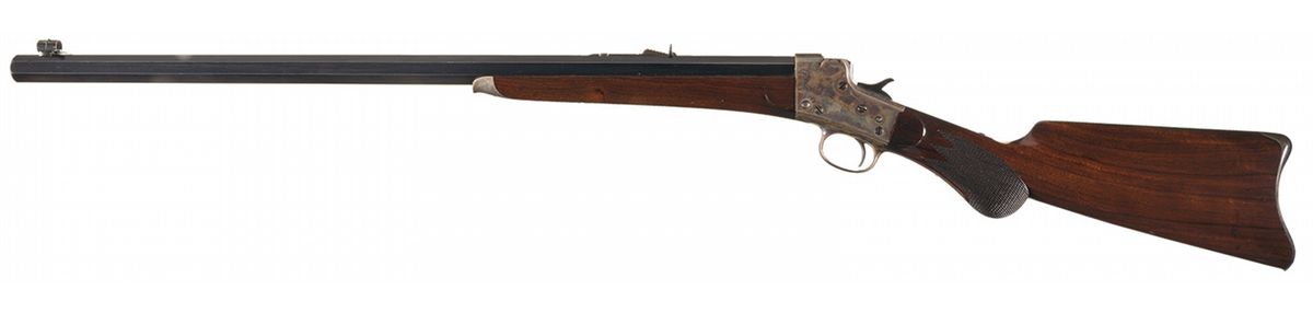 This lever activated falling block single shot target rifle was designed by Lewis Hepburn and was manufactured from 1883 to 1907 with approximately 10,000 in total production. The top barrel flat is marked "E. REMINGTON & SONS. ILION. N.Y." behind the rear sight. globe front sight and adjustable rear sporting sight. The lower right side of the receiver is marked "HEPBURNS PAT./OCT 7TH 1879" and the serial number is marked on the lower tang. The bottom barrel flat under the forearm is marked with the matching serial number and "38" ahead of the forearm. No complete cartridge designation is marked. Blue barrel, niter blue breechblock, hammer and trigger, casehardened remaining metal parts and mounted with a smooth forearm with an iron forend insert, and checkered round knob pistol grip stock with iron sporting style buttplate.