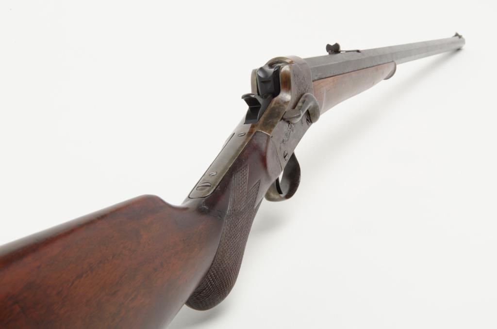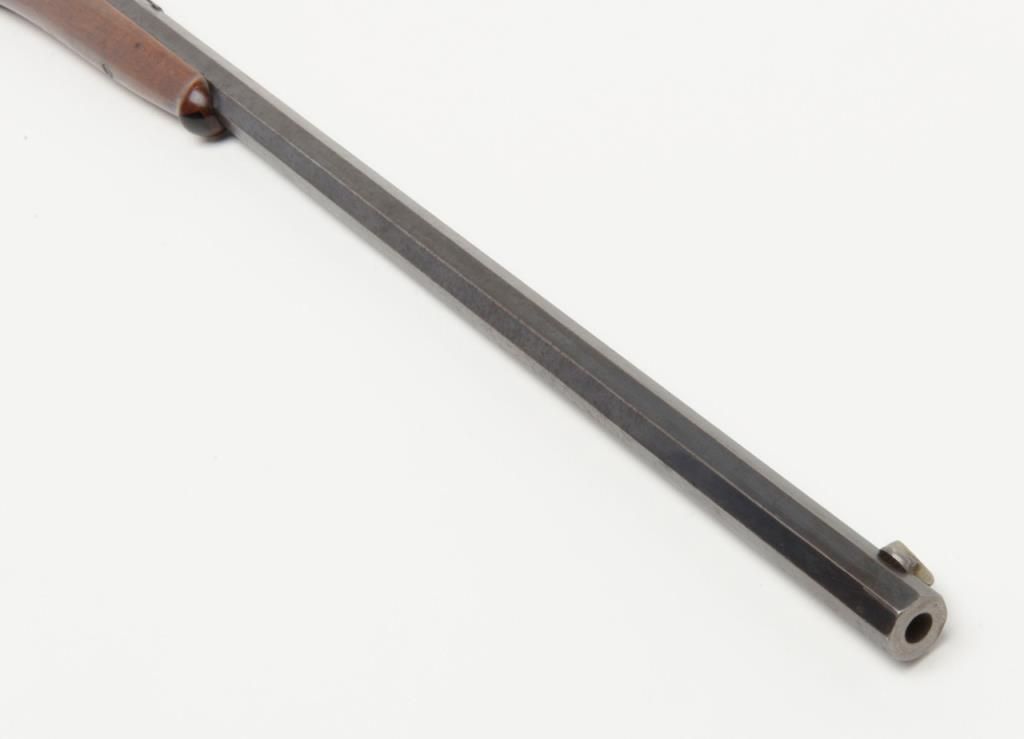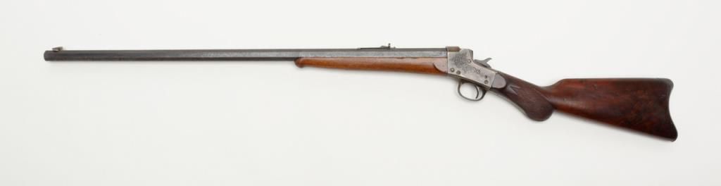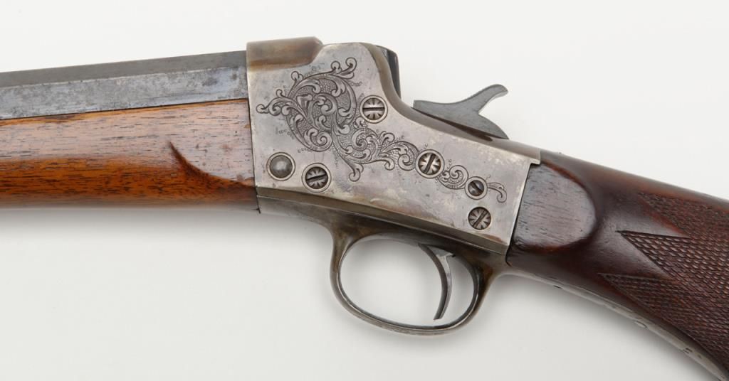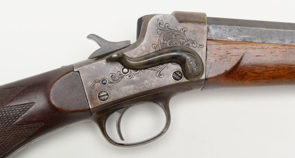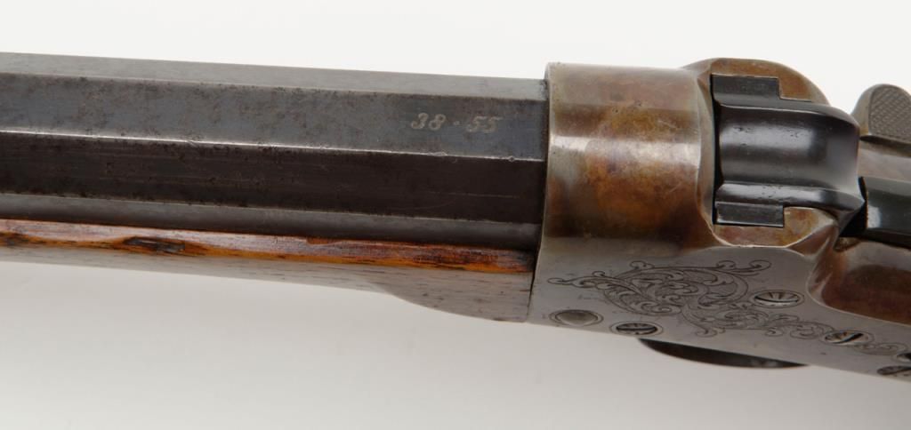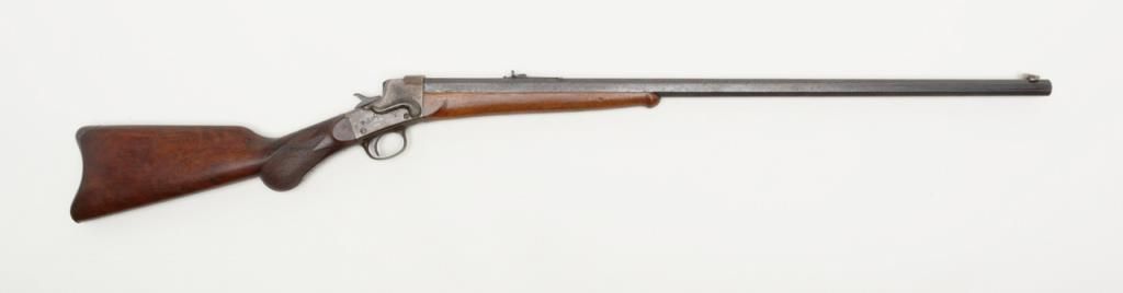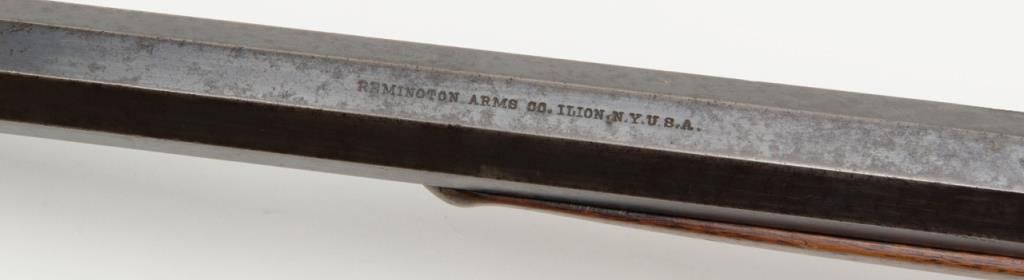 Remington Hepburn single shot rifle, cal. 38-55 WCF, Serial 1183. The rifle is in overall good to very good condition with a 30” blued octagon barrel. The barrel retains approximately 40% blue with sharp edges and clear markings showing somelight surface rust and erosion. The rifle retains a silver blade front and standard rear sight. The action has drifted to silver with muted case colors still displayed, most prominently on the breech lever. The action is scroll engraved onboth sides as is the trigger guard. The finely checkered wood stocks are in overall good condition showing marks consistent with use and age. The bore is very good and may clean, while the action locks up tight. The markings are still clear and legible on this nice old Hepburn. The original metal crescent butt plate shows moderate surface pitting at the top. (Antique/PPT). Est.: $1,100-$2,200.