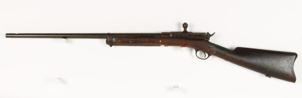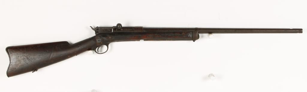Early bolt action magazine rifle with 24-1/2" round barrel. Exposed hammer, sights have been removed, and stock shows multiple cracks and repairs. Poor bore and working action. Condition: Poor with moderate pitting covering metal surfaces and wood is poor.