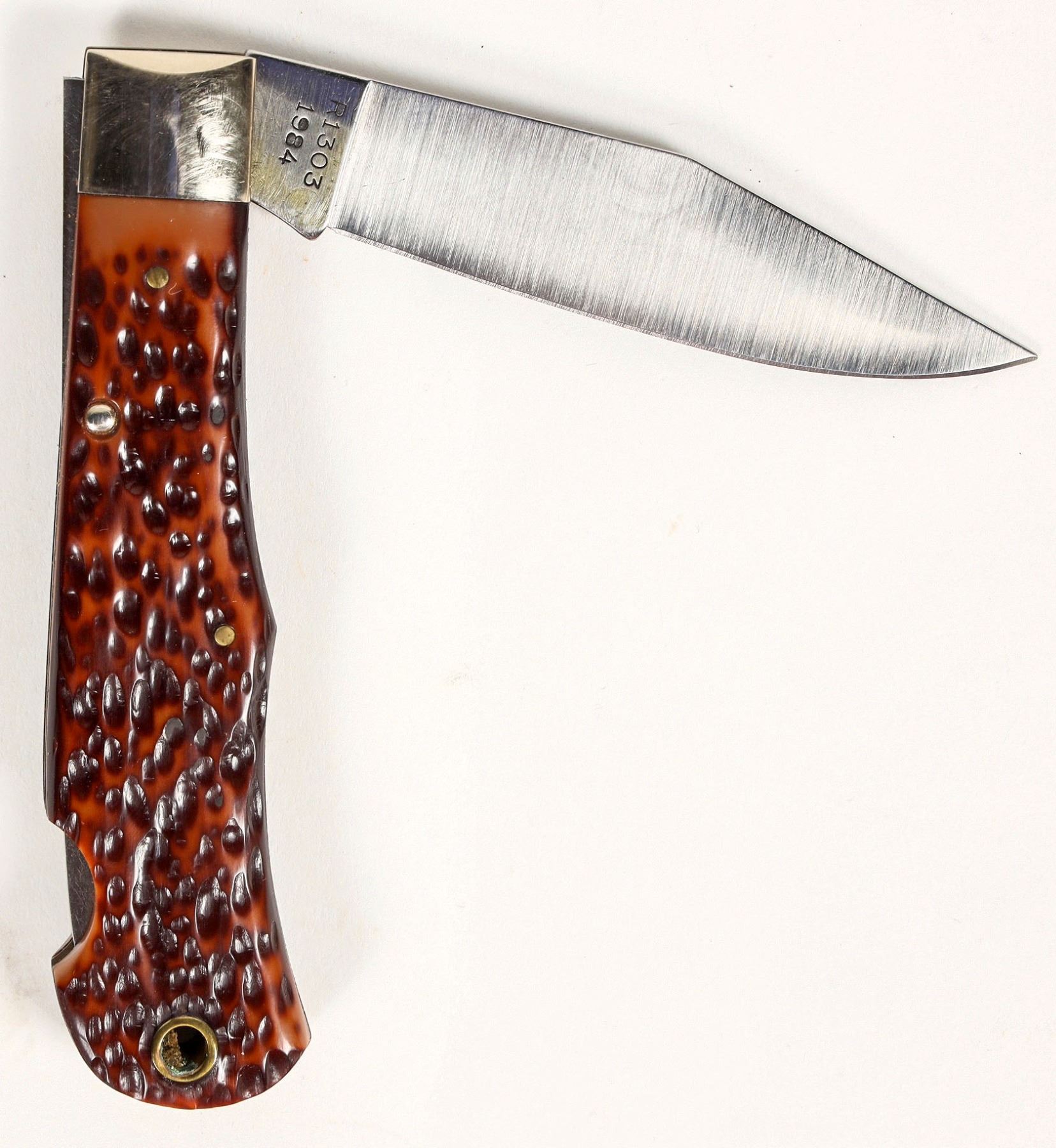 This is a Remington lockback model R1303 like new with box and paperwork. C.1984. Jigged delrin scales and nickel bolsters. 4.5 in. closed. Please see photos for details.